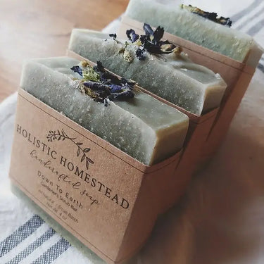 Hands in the dirt, head in the sun, heart with nature. Down To Earth herbal soap is your go-to soap after a day in the garden. Pumice & walnut shell powder help to gently scrub away dirt & grime while all-natural oils & butters nourish skin. Carrying a subtle grounding, earthy aroma with lavender, rosemary, & patchouli essential oils & infused with our homegrown garden sage to offer additional anti-bacterial properties. This herbal soap will quickly become a favorite in your home. Perfect for gardener's, mechanics, or anyone who needs a good scrub soap. 4oz. *Soap weight and appearance may vary slightly due to the hand poured & hand cut nature of the bars.