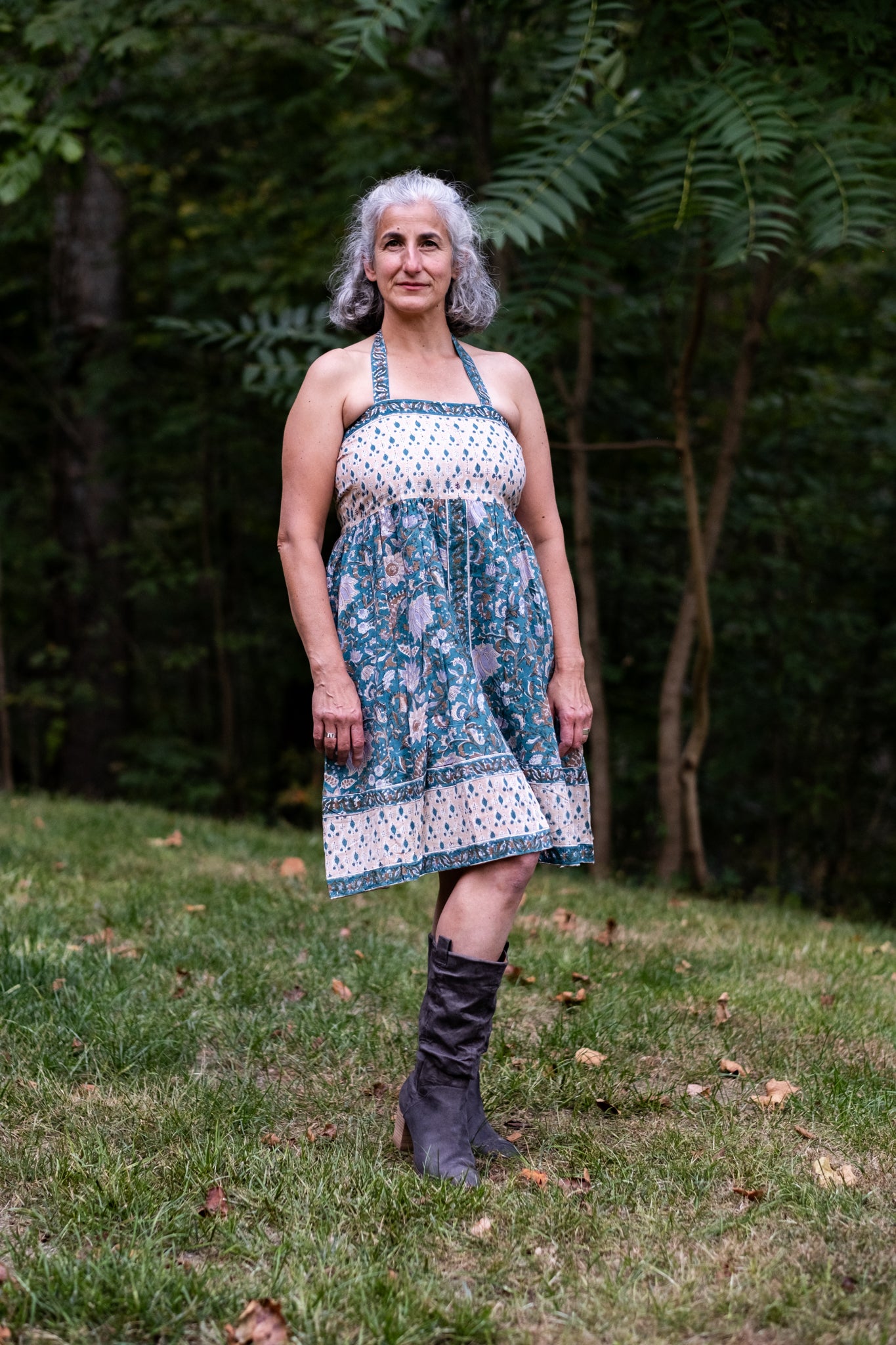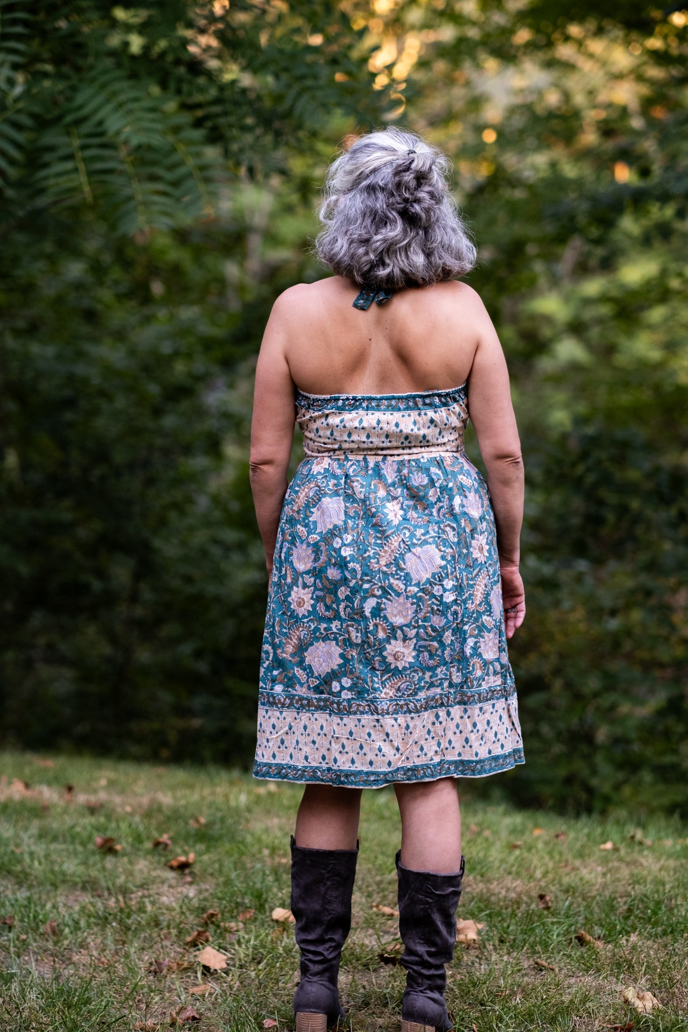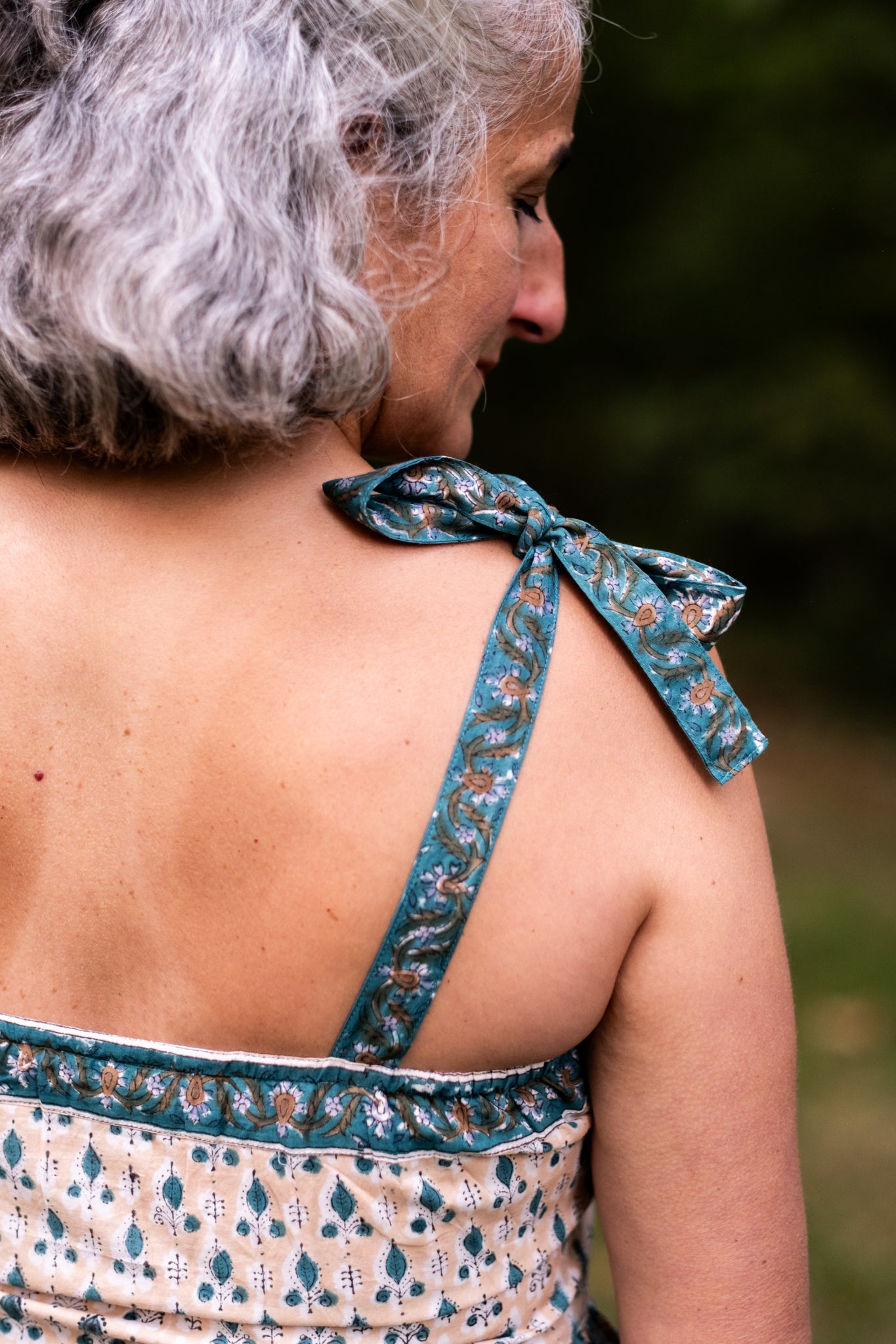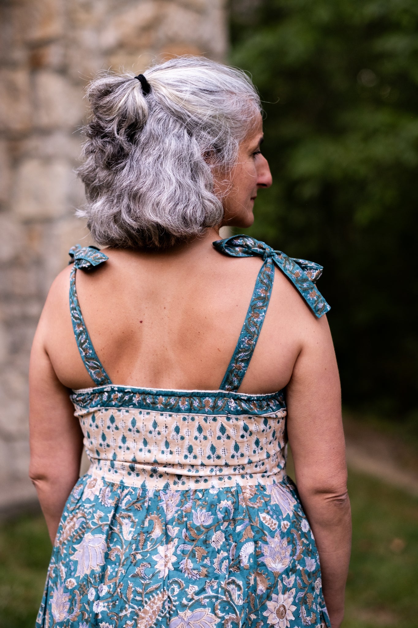 A Clarity classic in beige, turquoise, and purple - Fiona is a beautiful sundress with cool tones and beautiful florals. The dark turquoise ribbon tie sleeves are hand dyed with flower vines twining up the shoulders. The dress features two deep pockets, and a soft cotton voile lining for modesty and comfort. The beautiful A line dress falls at the knees, dress it up with heels or cowboy boots and sunglasses or throw on your favorite sandals.