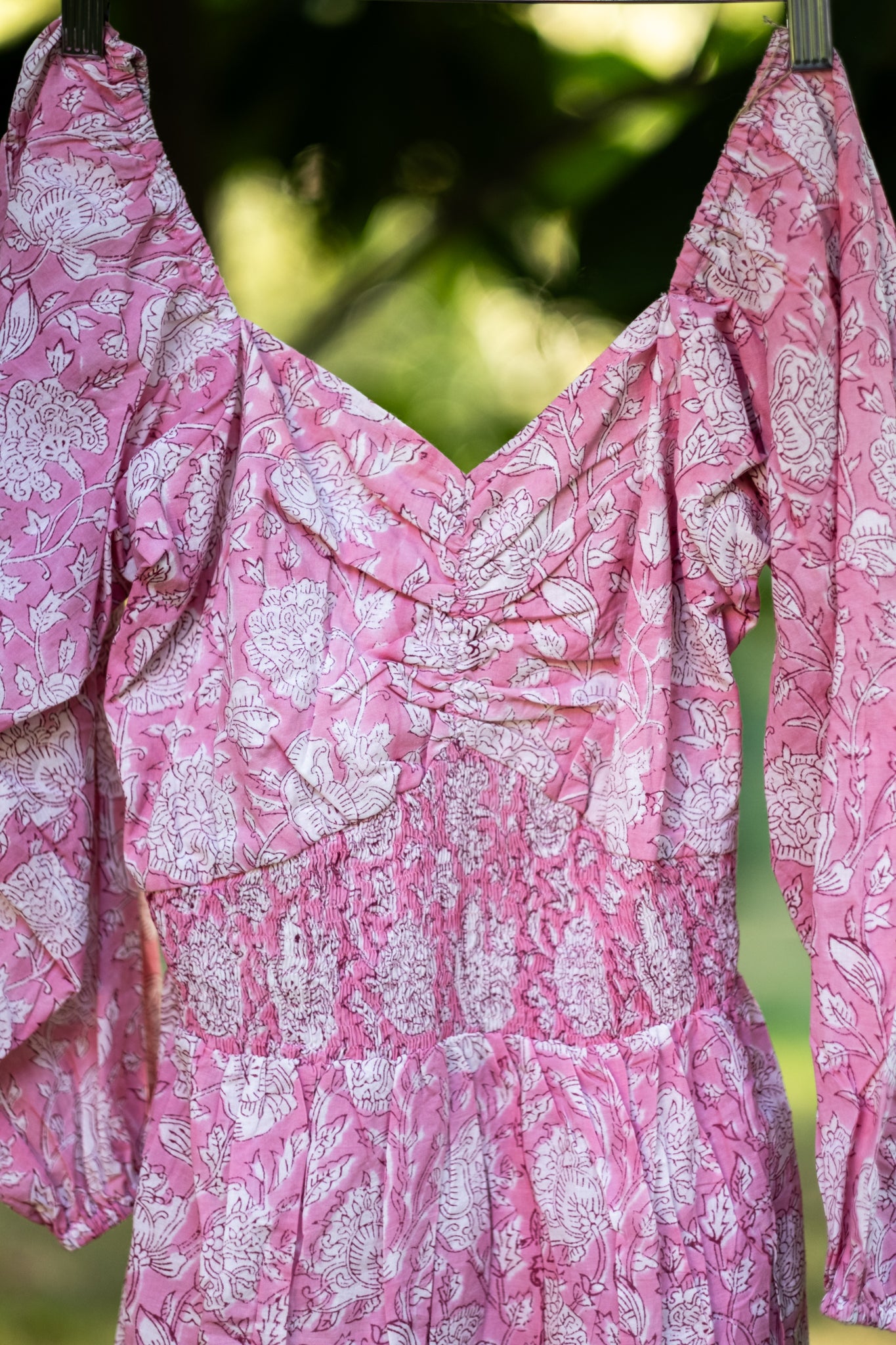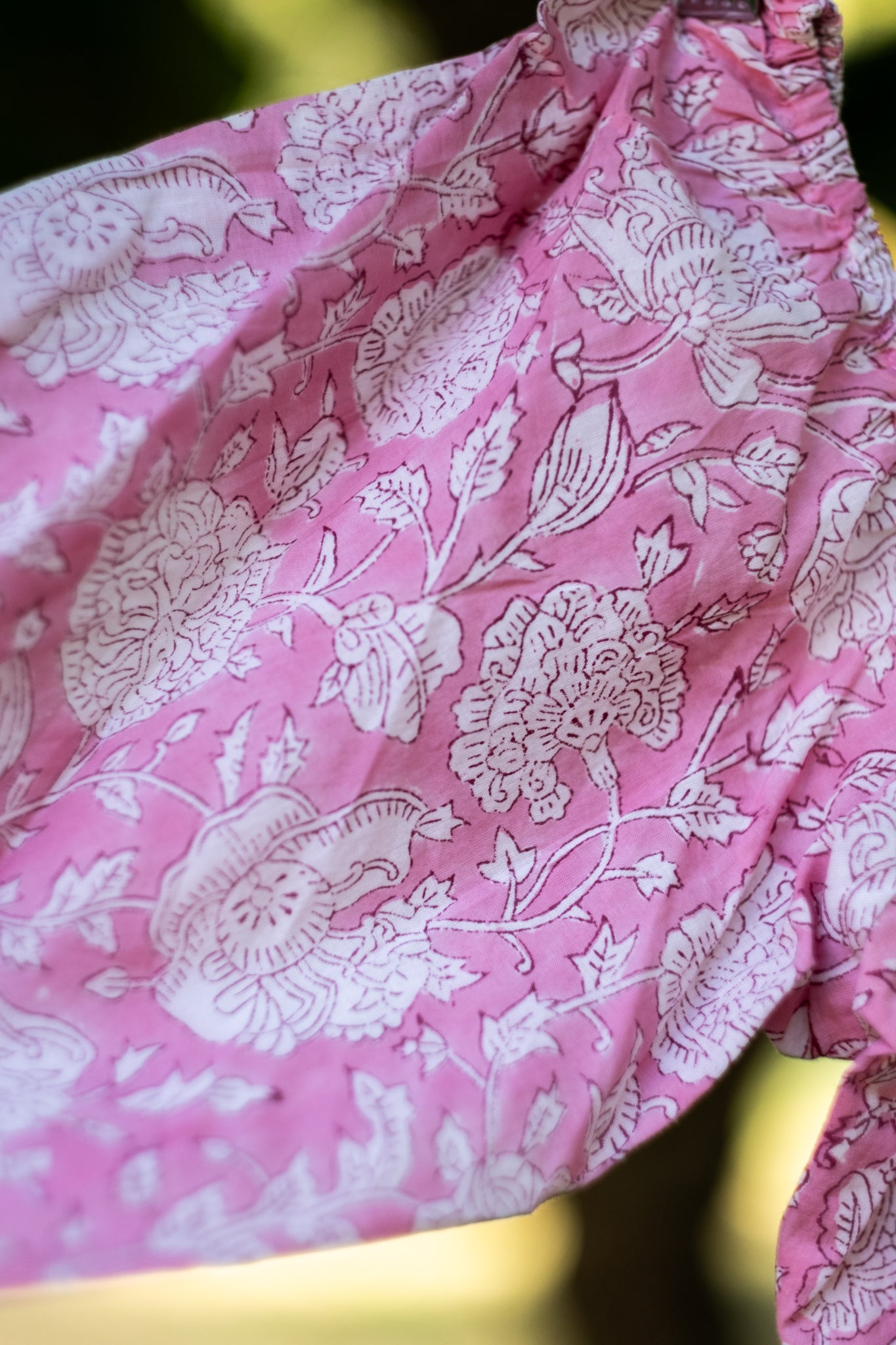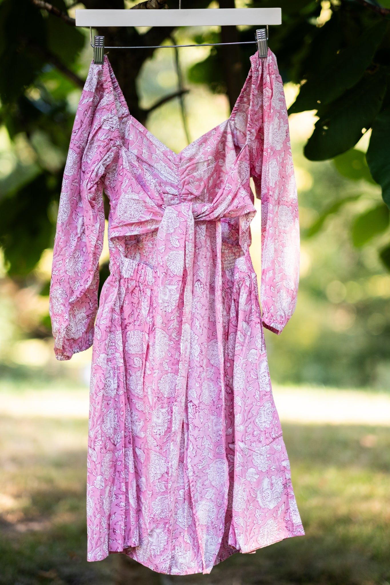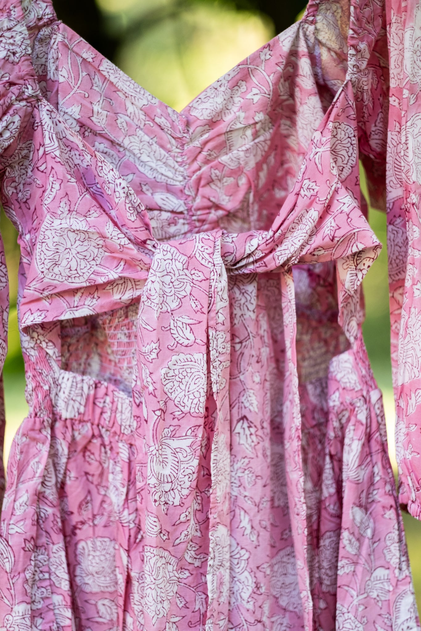 One of our brightest patterns, Isabel is a beautiful bubblegum pink. The bodice has a supportive stretch midsection, a modest sweetheart/V neck neckline, ties in the back, and the hem at the bottom falls right at the knee.