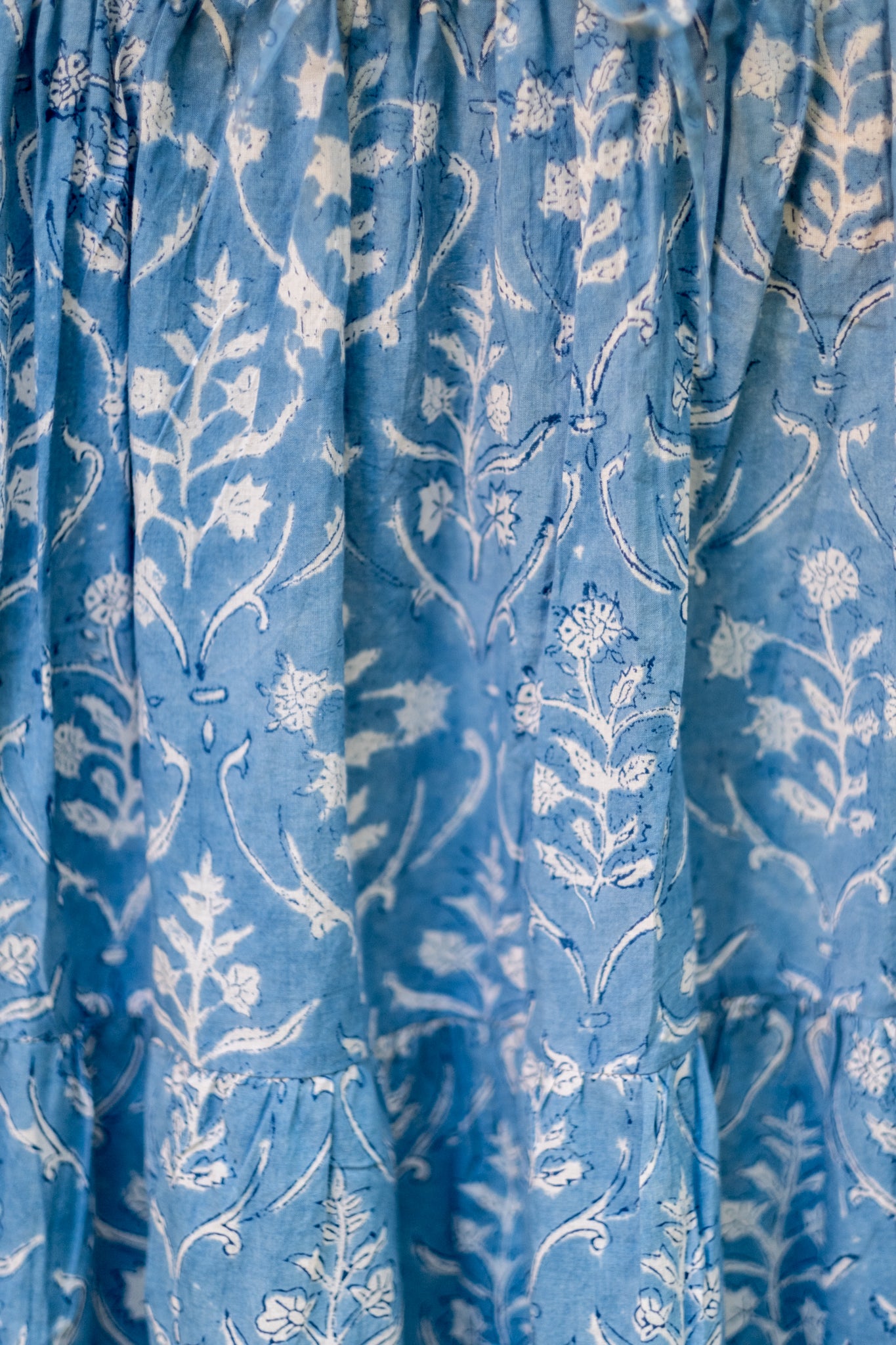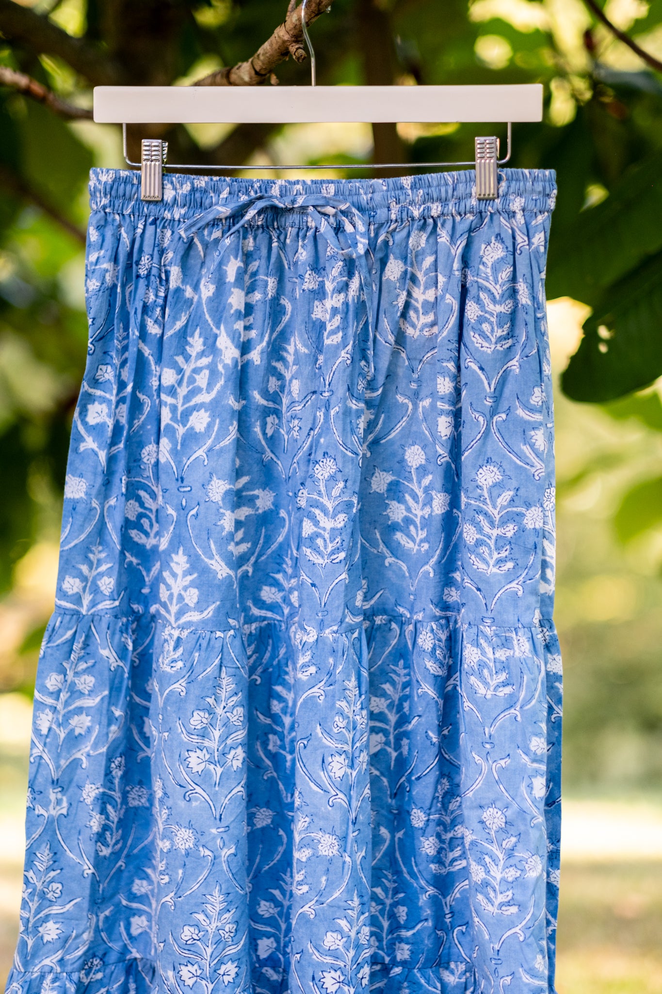 Enjoy our 100% cotton skirt with cornflower blue fabric, beautiful, white, and dark blue motif reminiscent of Positano.