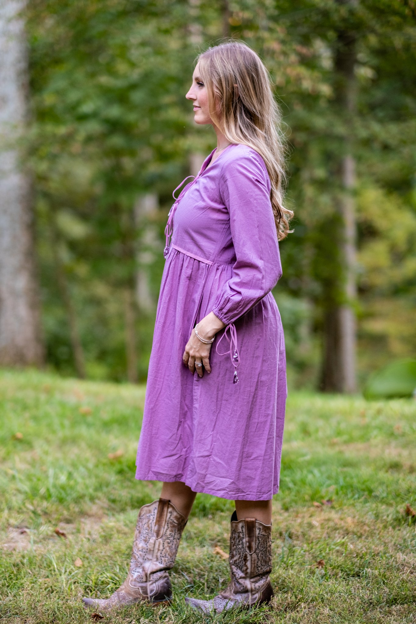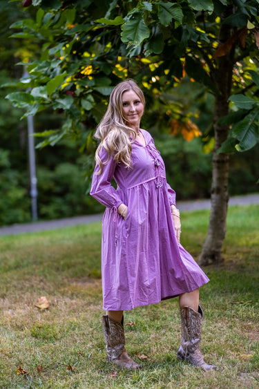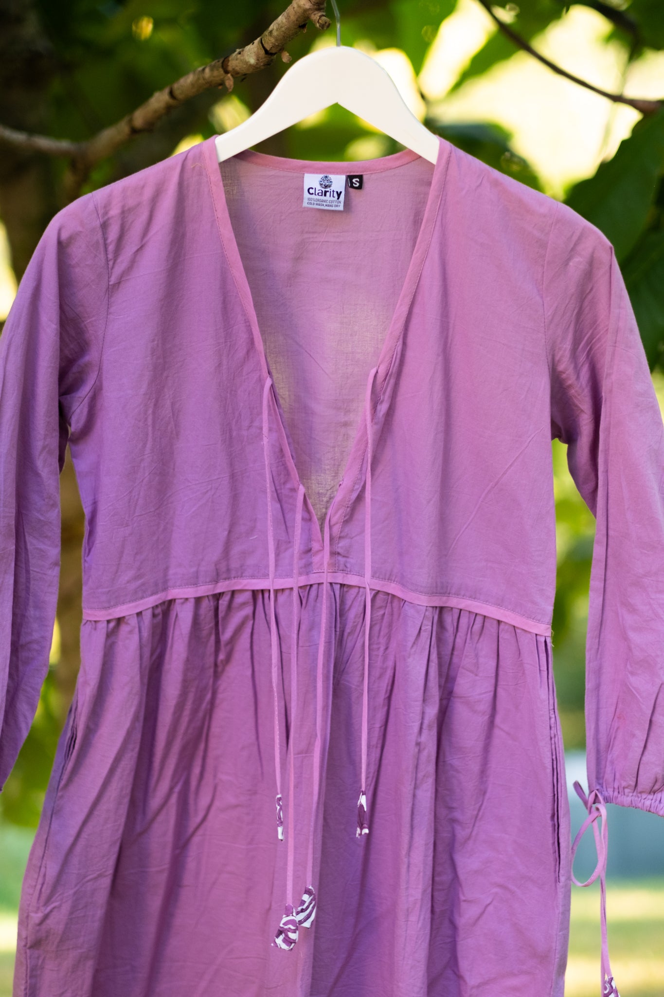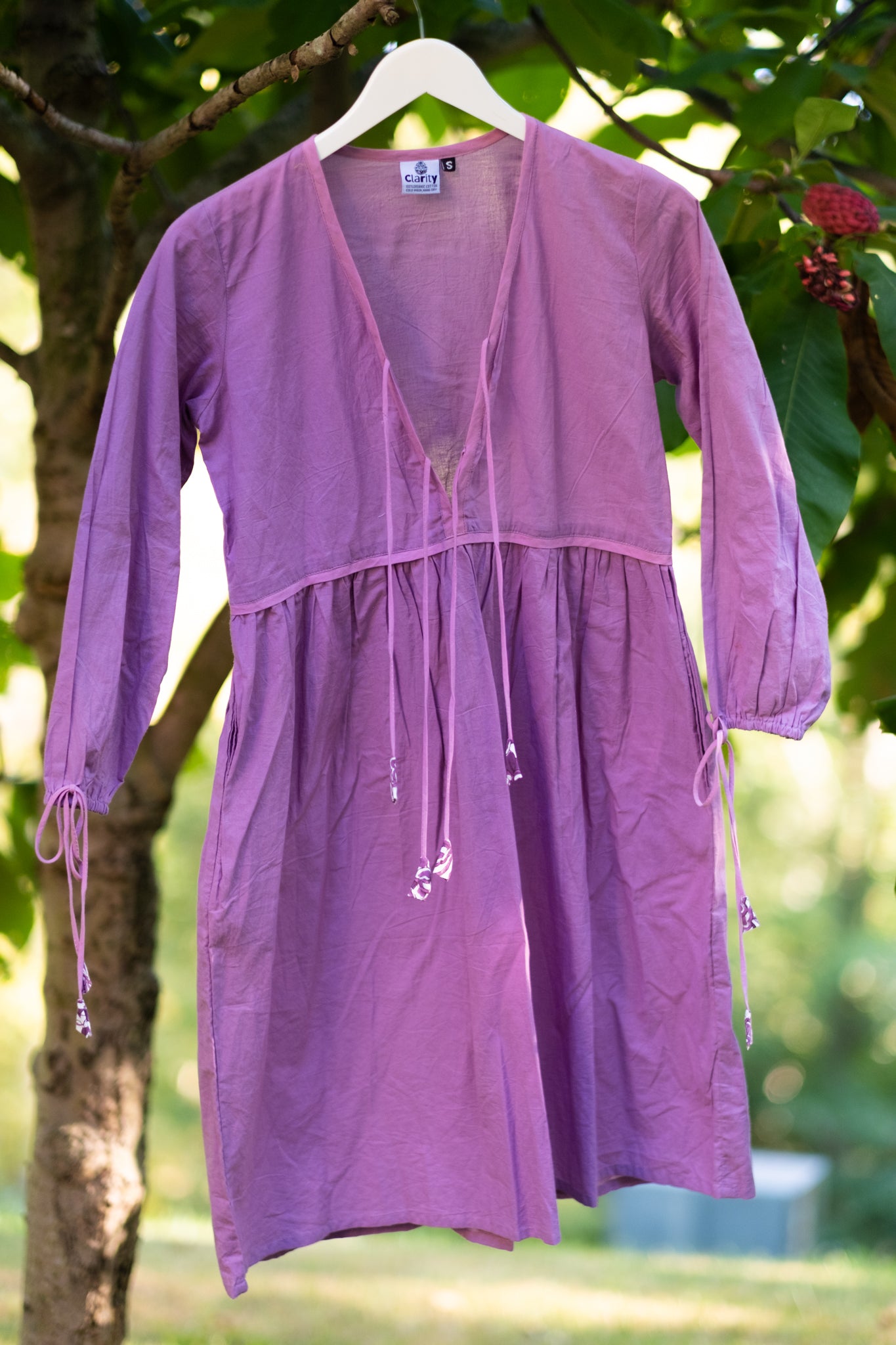 Made from 100% organic cotton, this dress is hand dyed by vegetable dyes and hand made by hand block artisans in Jaipur. Designed in rural Ohio, the Clara dress is a 3/4 sleeve everyday dress with comfy side pockets, a plunging V neck with 2 ties for modesty. The ties on the bust are mirrored on the sleeves and are detailed with hand block dyed fabric. Enjoy this knee length dress on warm or cool days, as the breathable cotton will keep you comfortable in most mild weather.