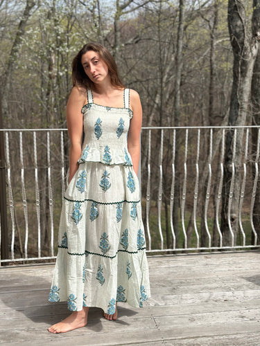 Fall in love with June, made from 100% organic cotton and hand painted with vegetable dyes. June features an ivory fabric with delicate sage and turquoise details. Enjoy the two pockets that come in the three tiered skirt. This dress is fitted through the bodice and flowy through the ankle length skirt.