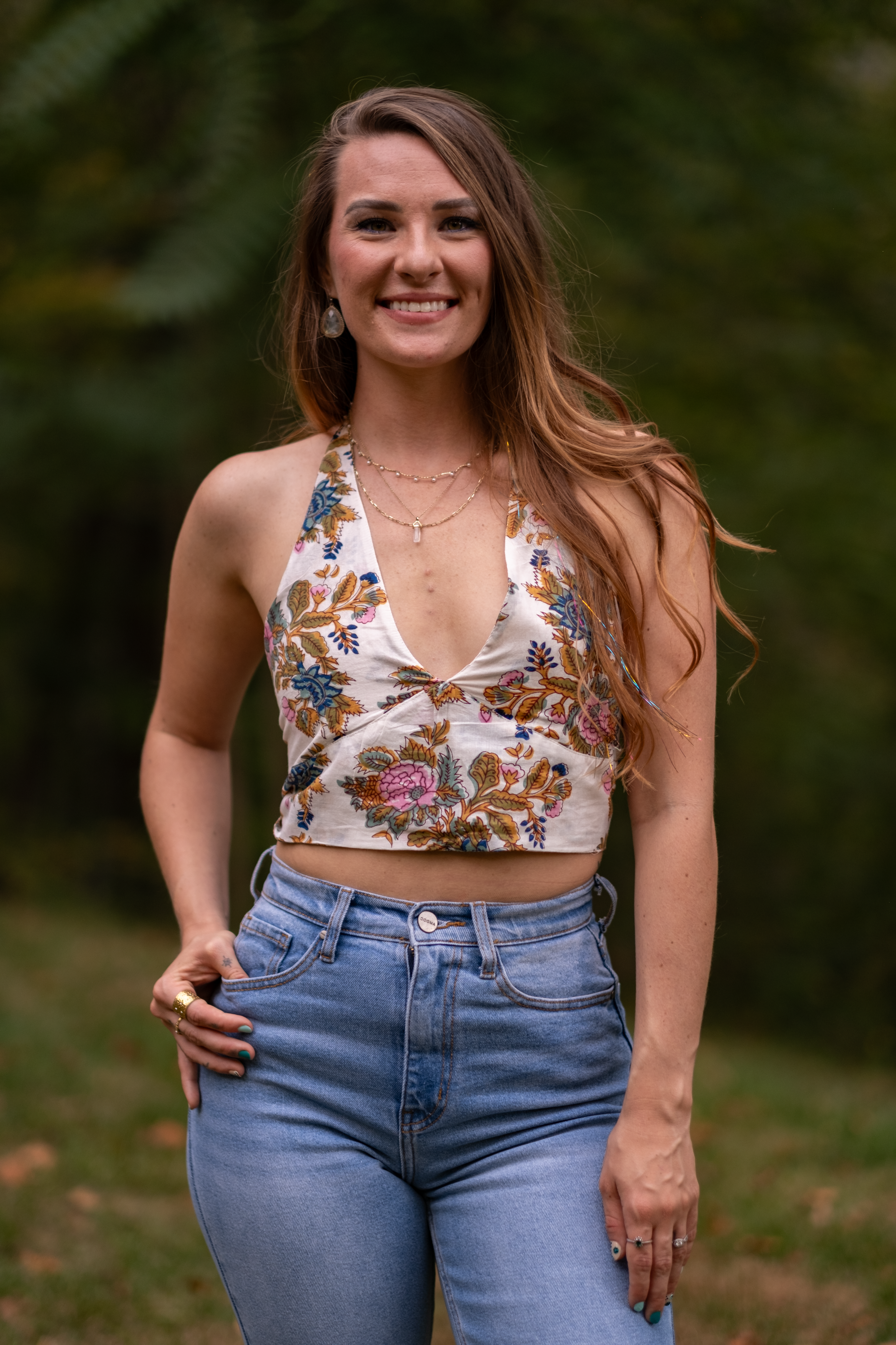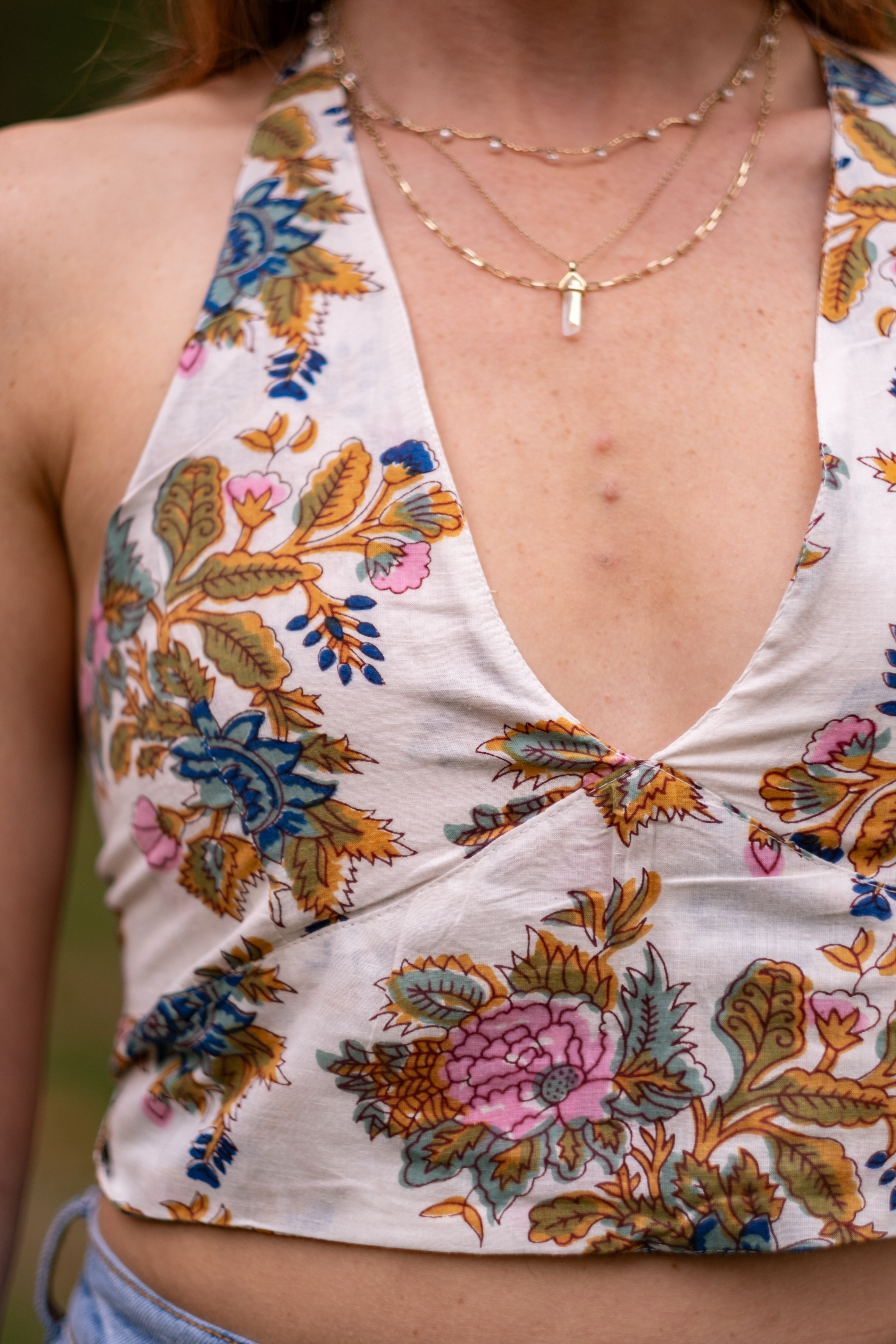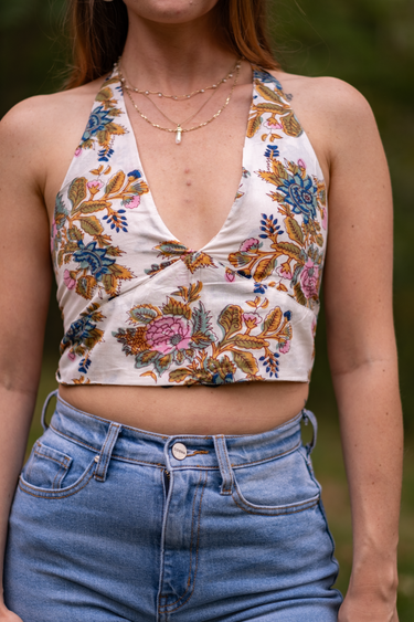 Bella is a 100% Cotton top that ties behind the neck and behind the back to ensure the perfect fit. The fabric is hand dyed with hand block printing and hand made in India. The top is beautiful in complimenting shades of gold, pink, blue, and white.
