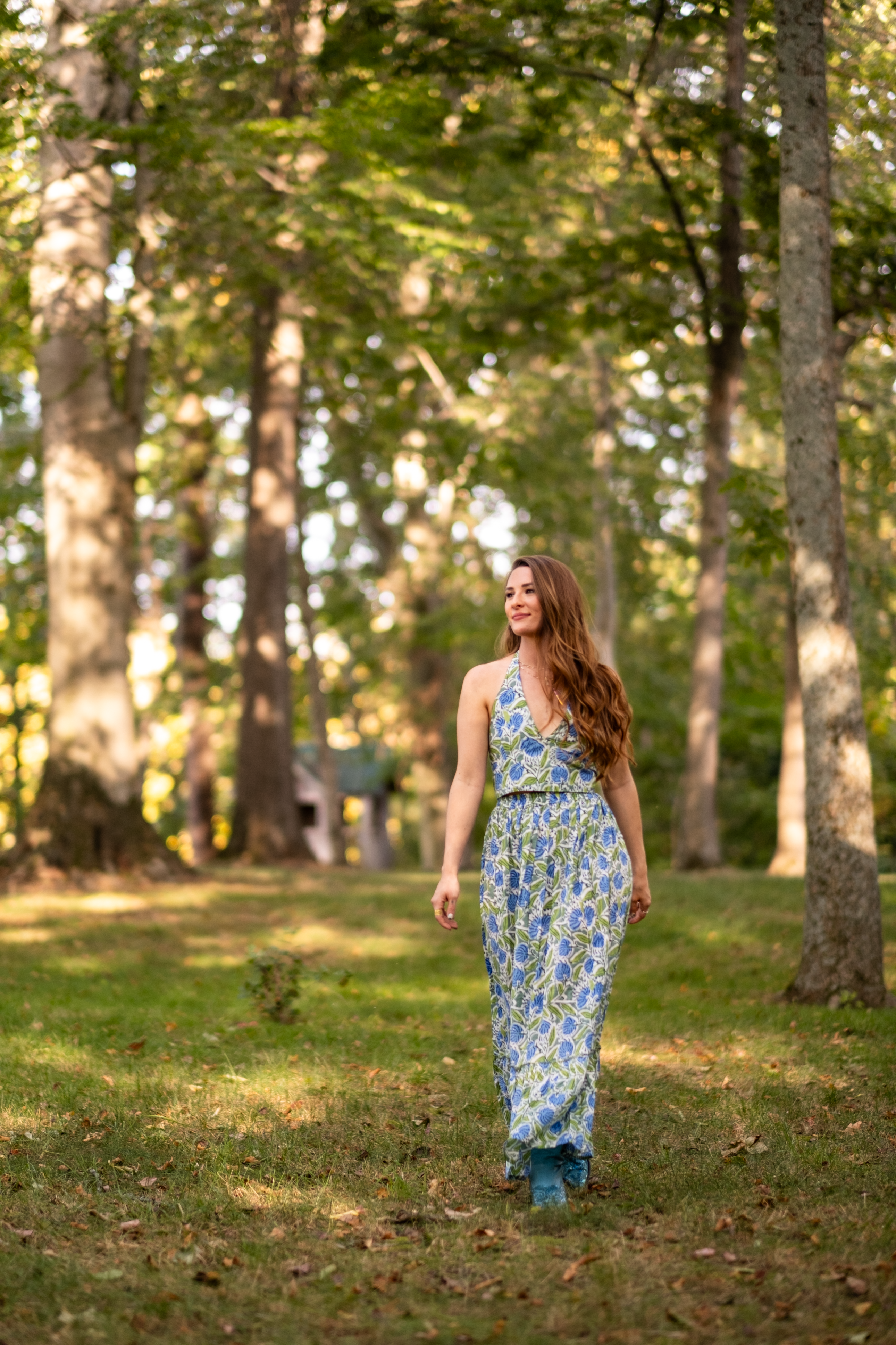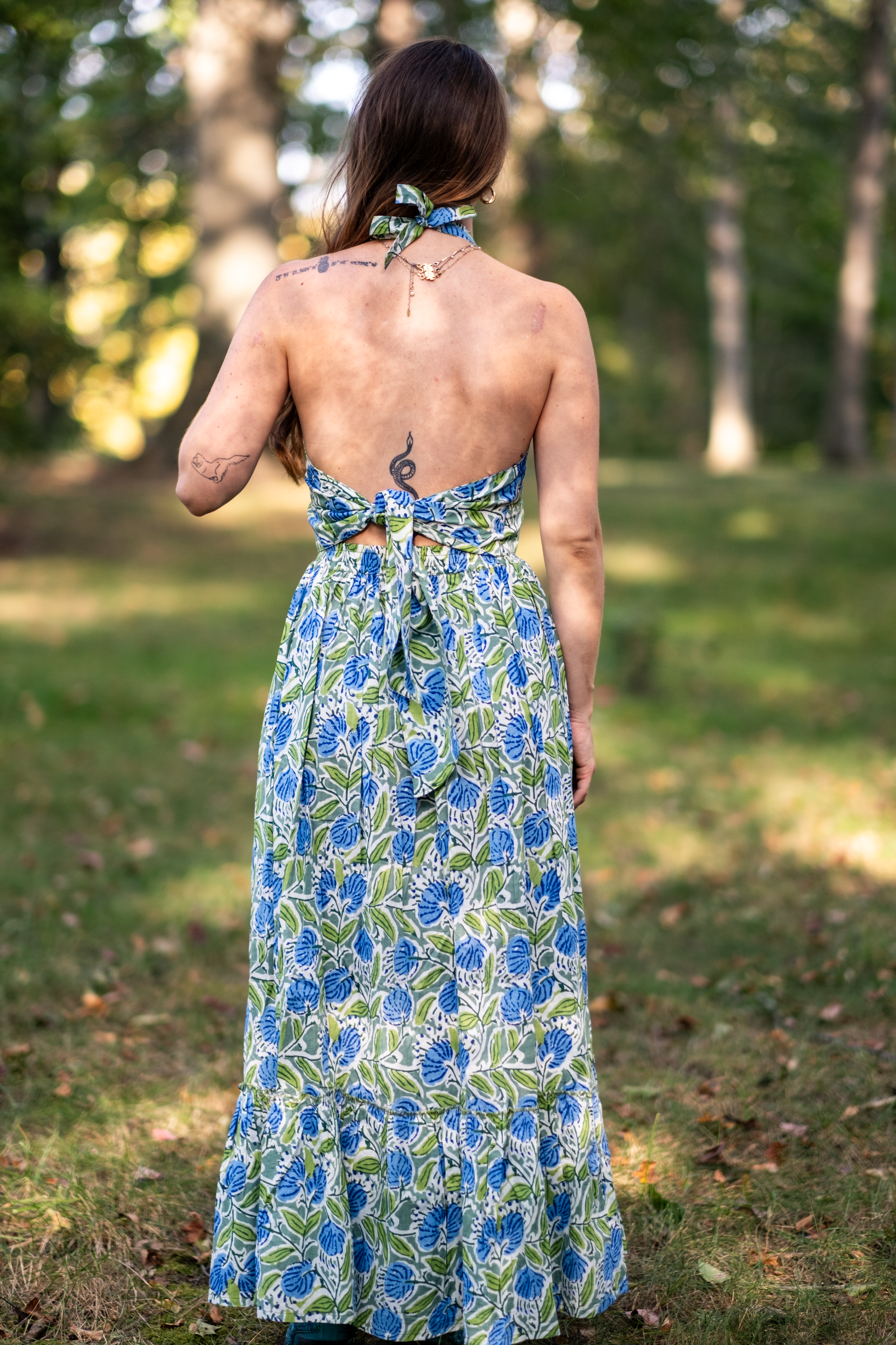 Bella is a 100% Cotton maxi skirt that falls at ankle length, complete with pockets. The fabric is hand dyed with hand block printing and hand made in India. The top is beautiful in complimenting shades of green, blue, and white.