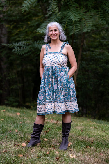 A Clarity classic in beige, turquoise, and purple - Fiona is a beautiful sundress with cool tones and beautiful florals. The dark turquoise ribbon tie sleeves are hand dyed with flower vines twining up the shoulders. The dress features two deep pockets, and a soft cotton voile lining for modesty and comfort. The beautiful A line dress falls at the knees, dress it up with heels or cowboy boots and sunglasses or throw on your favorite sandals.