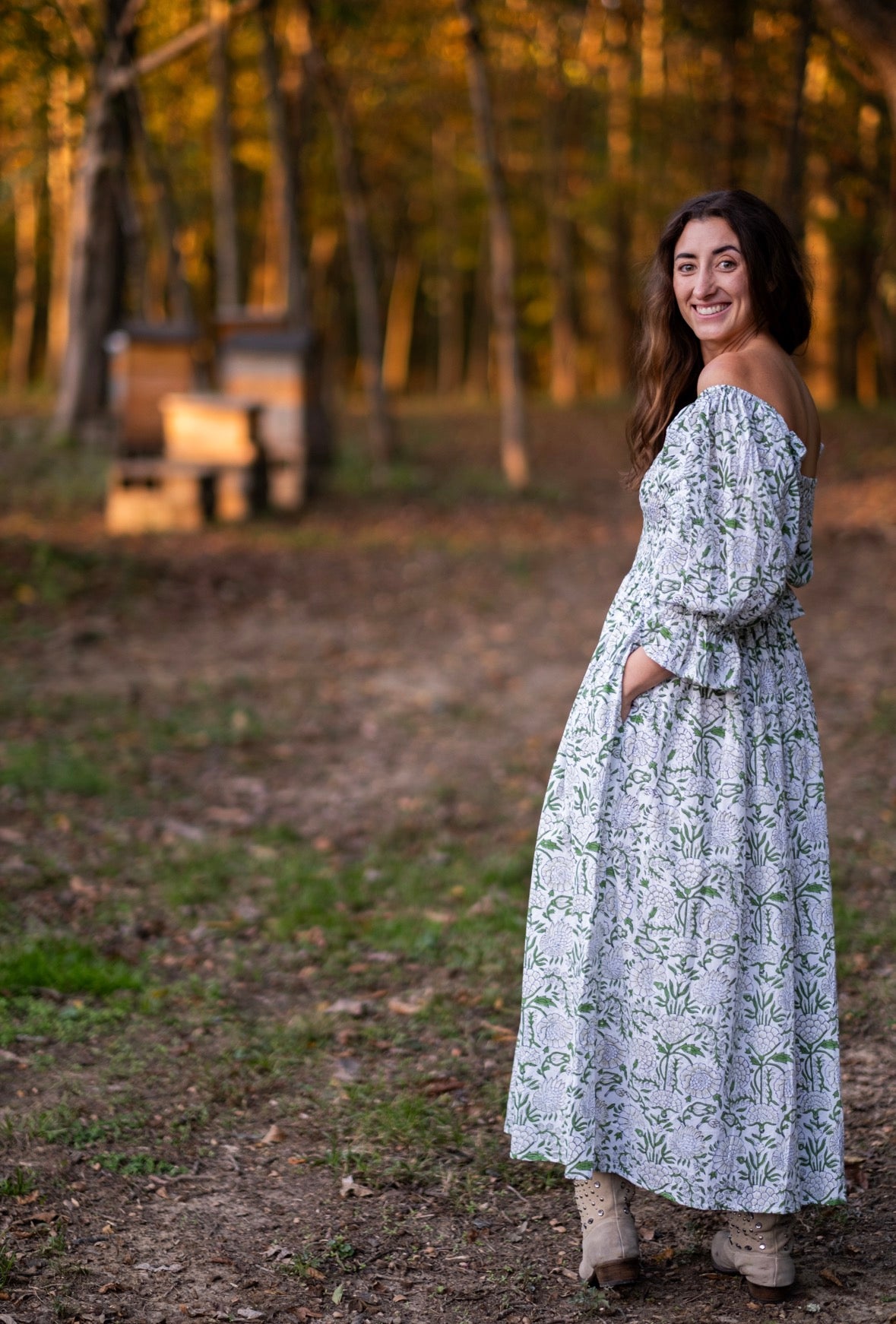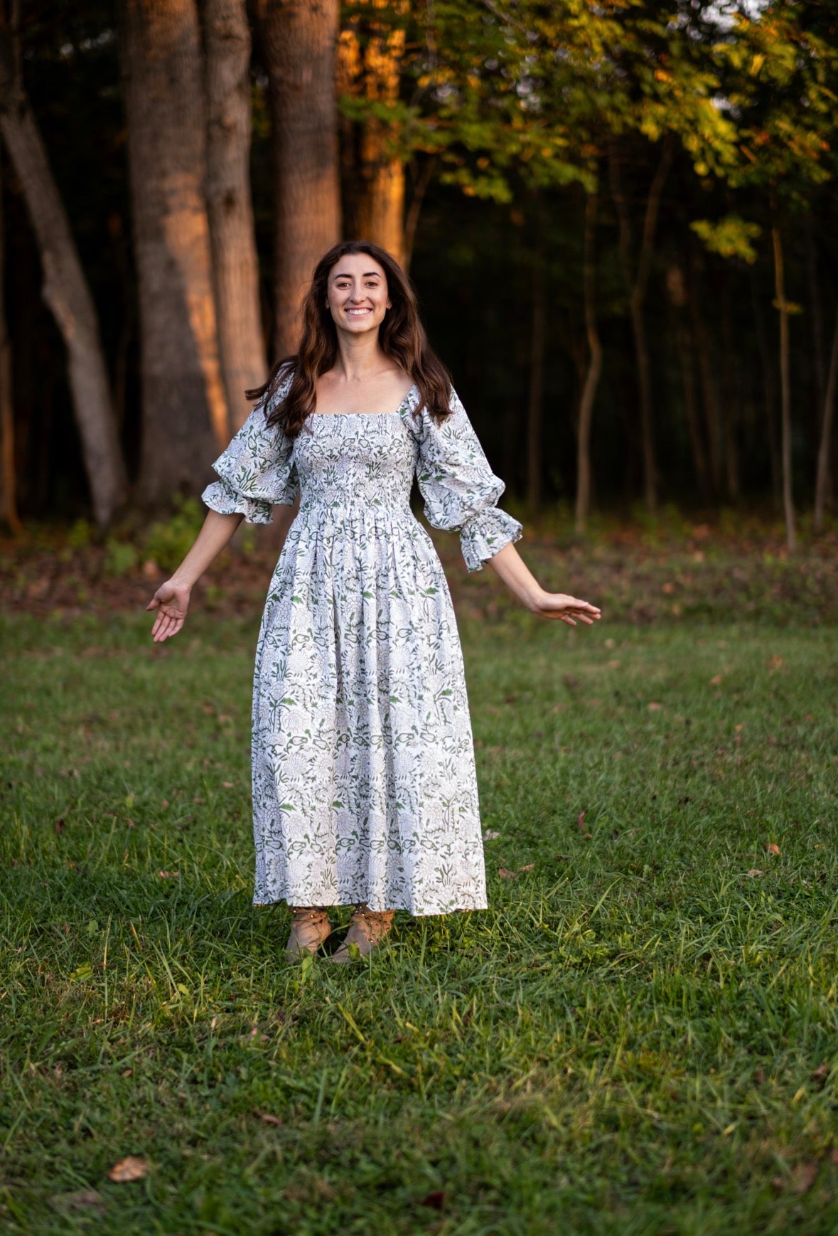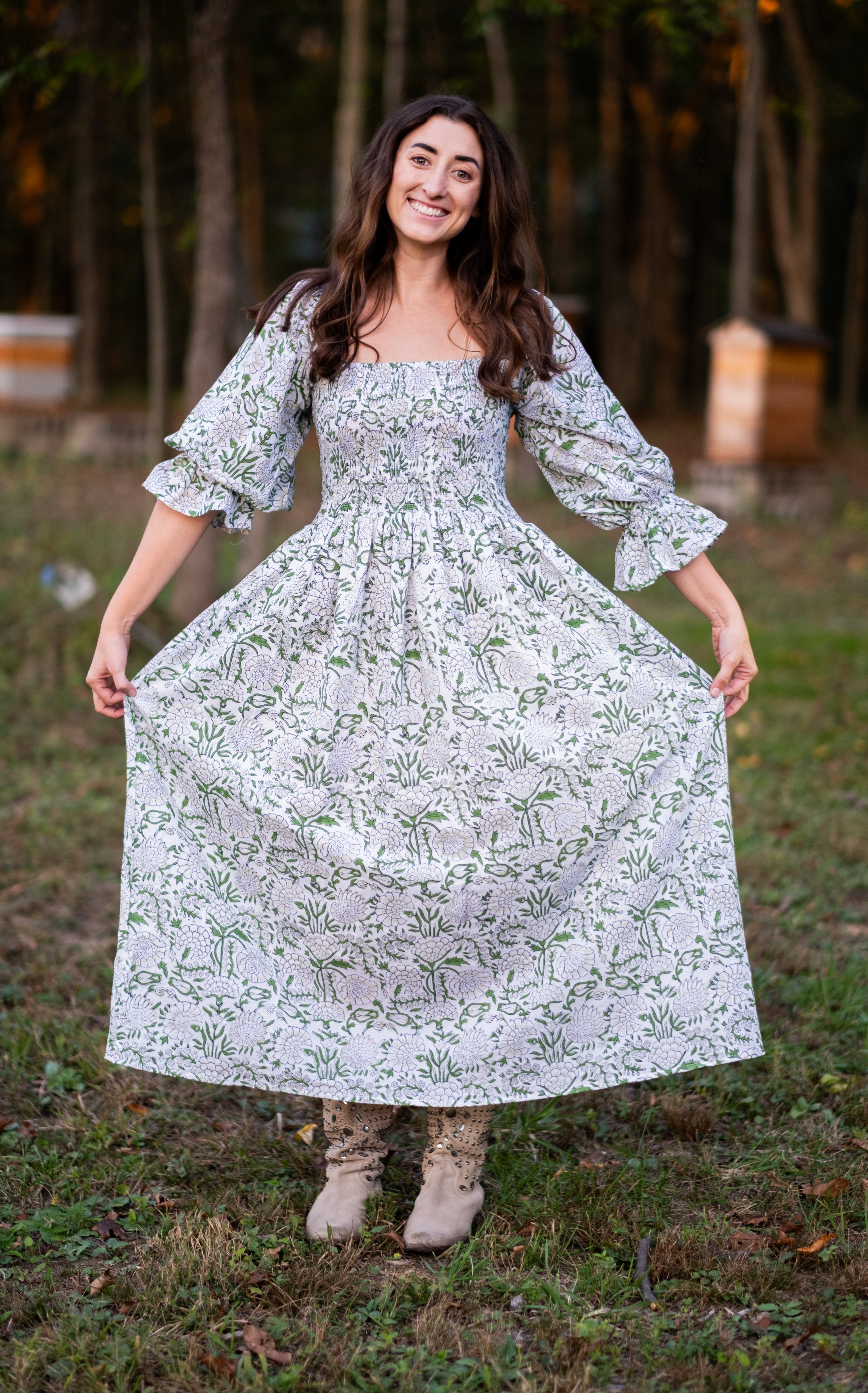 Our first Fall Debut, Elizabeth is a beautiful fresh white and sage with 3/4 balloon sleeves with tapered flare at the end. Enjoy a stretchy, supportive bodice and the perfect long skirt. The dress features two deep pockets, and a soft cotton voile lining for modesty and comfort. The beautiful A line dress falls at the ankles, dress it up with heels or cowboy boots and sunglasses or throw on your favorite sandals.