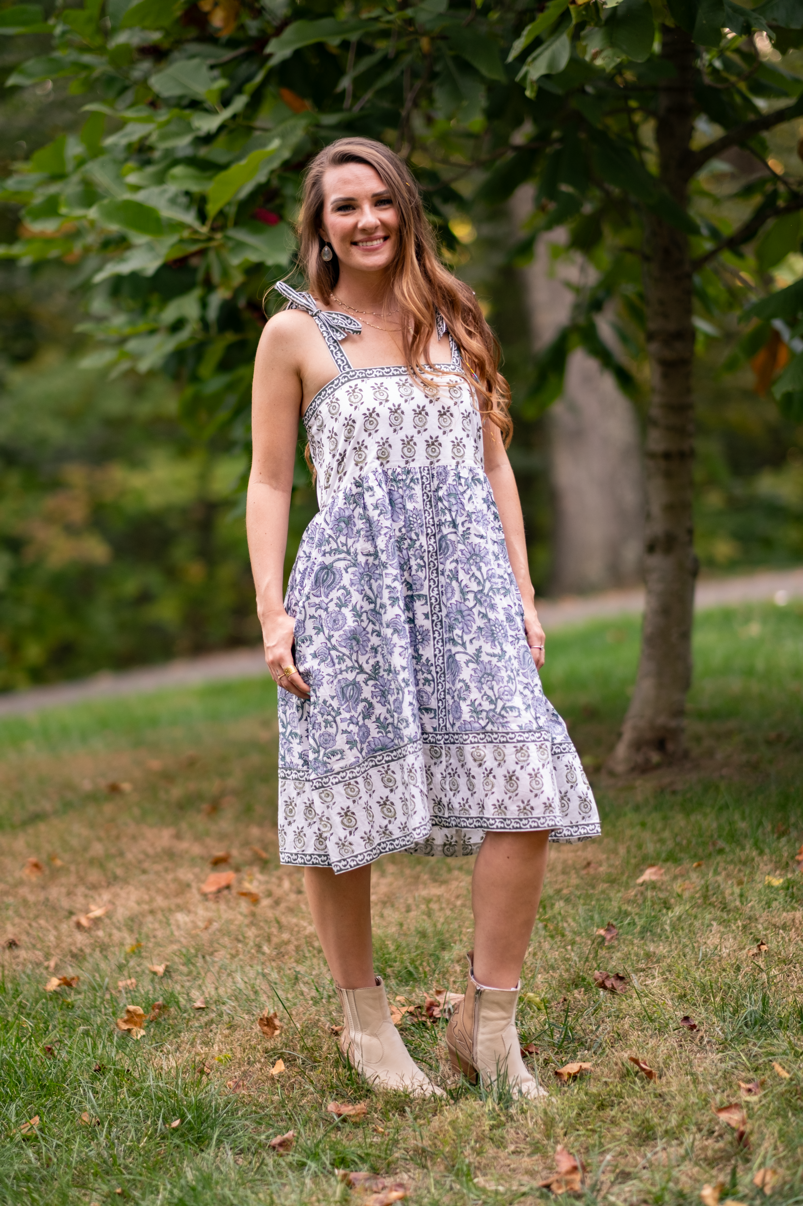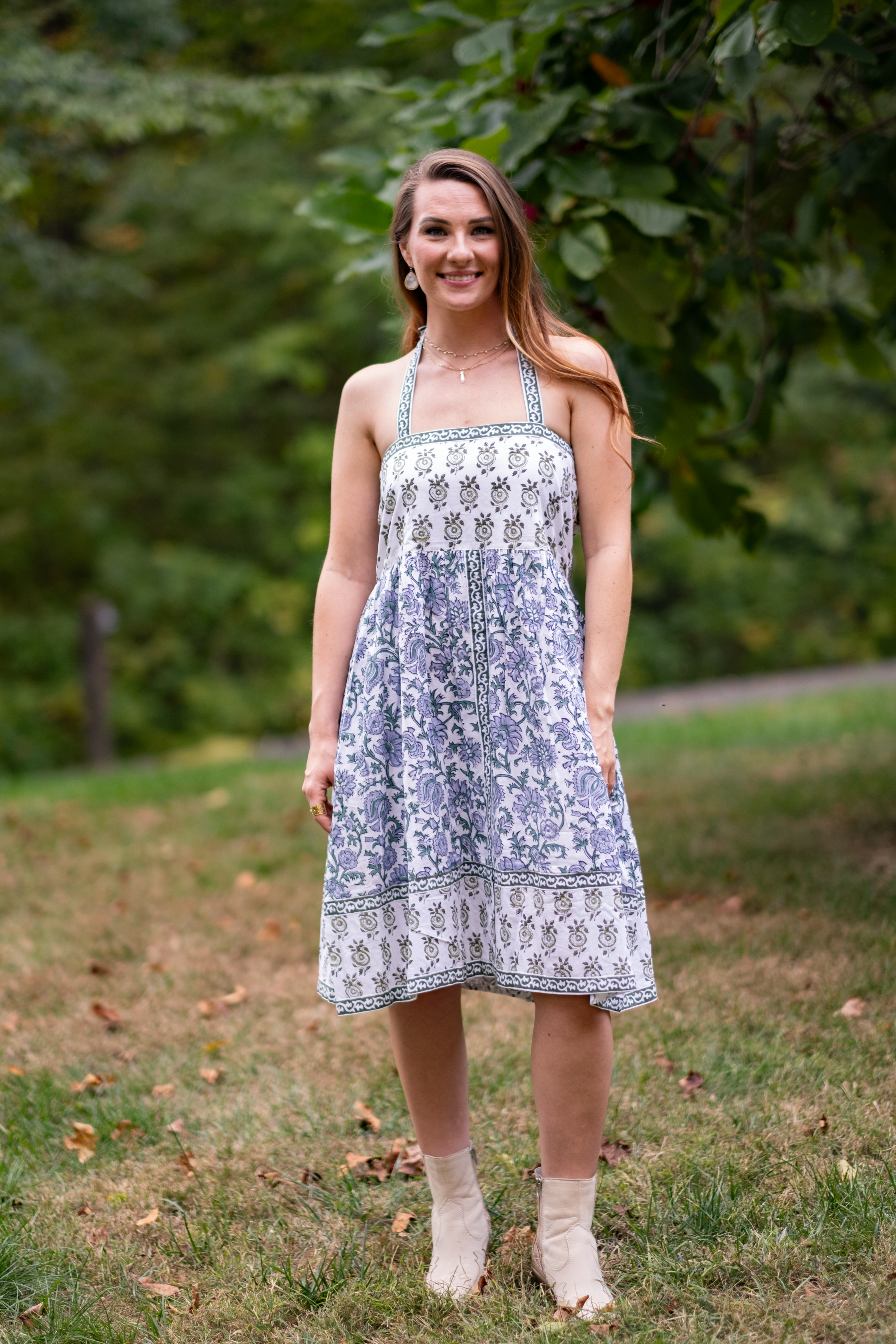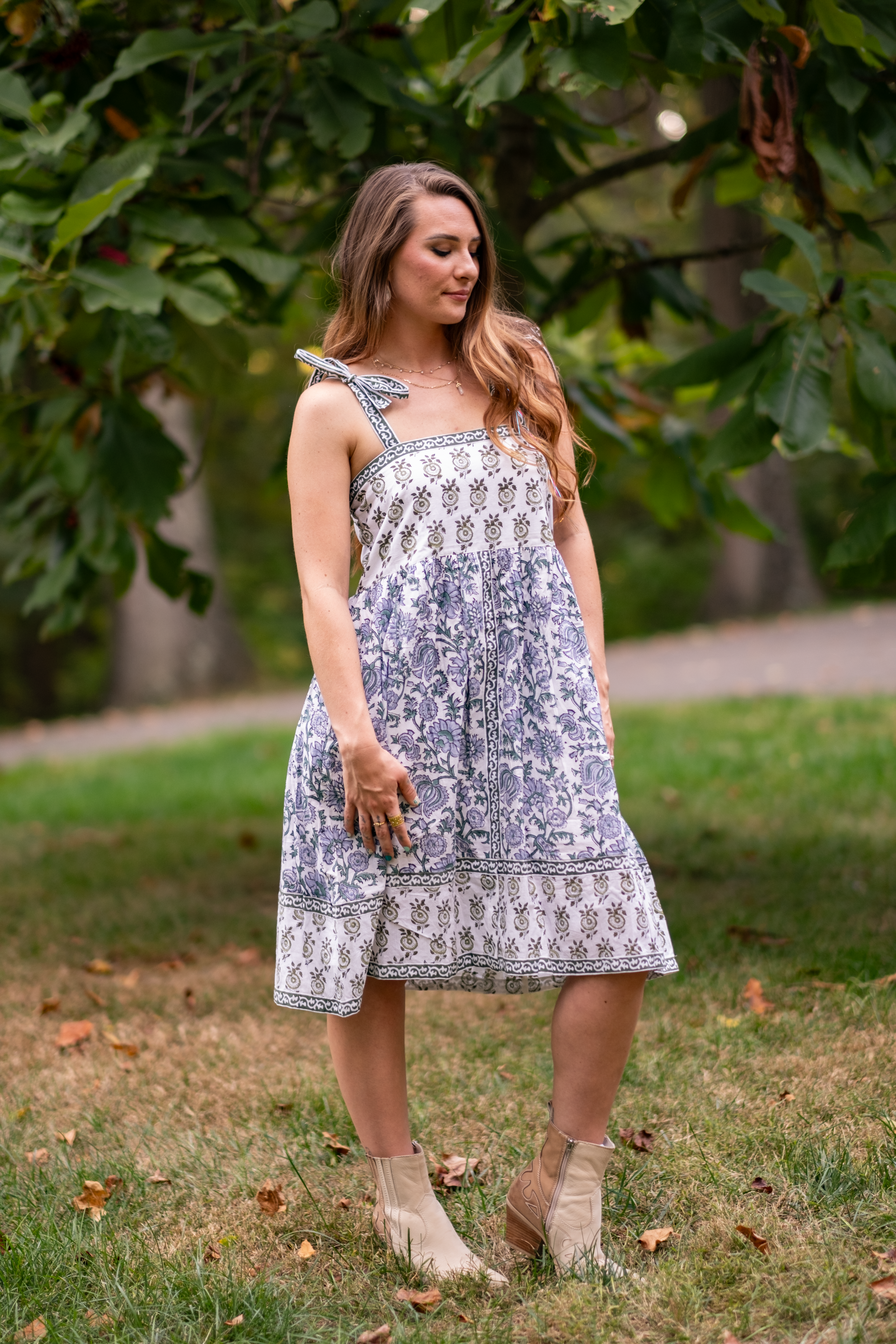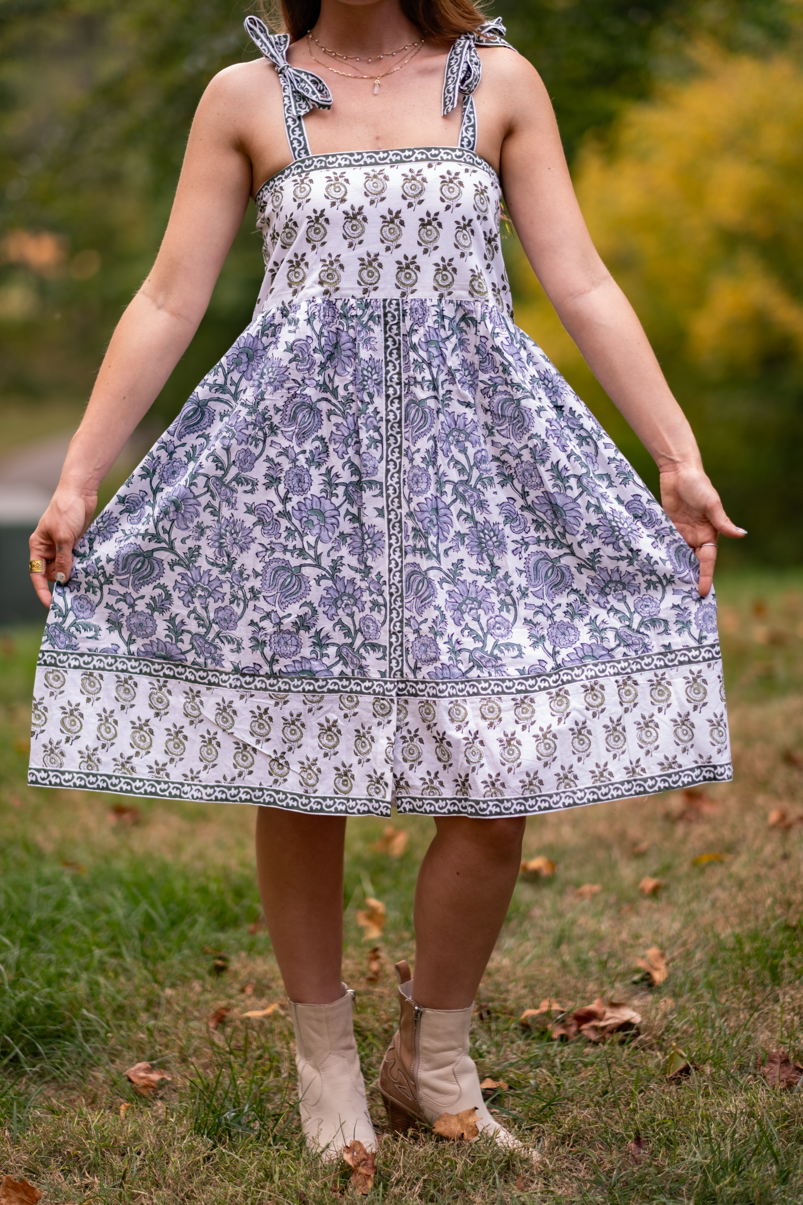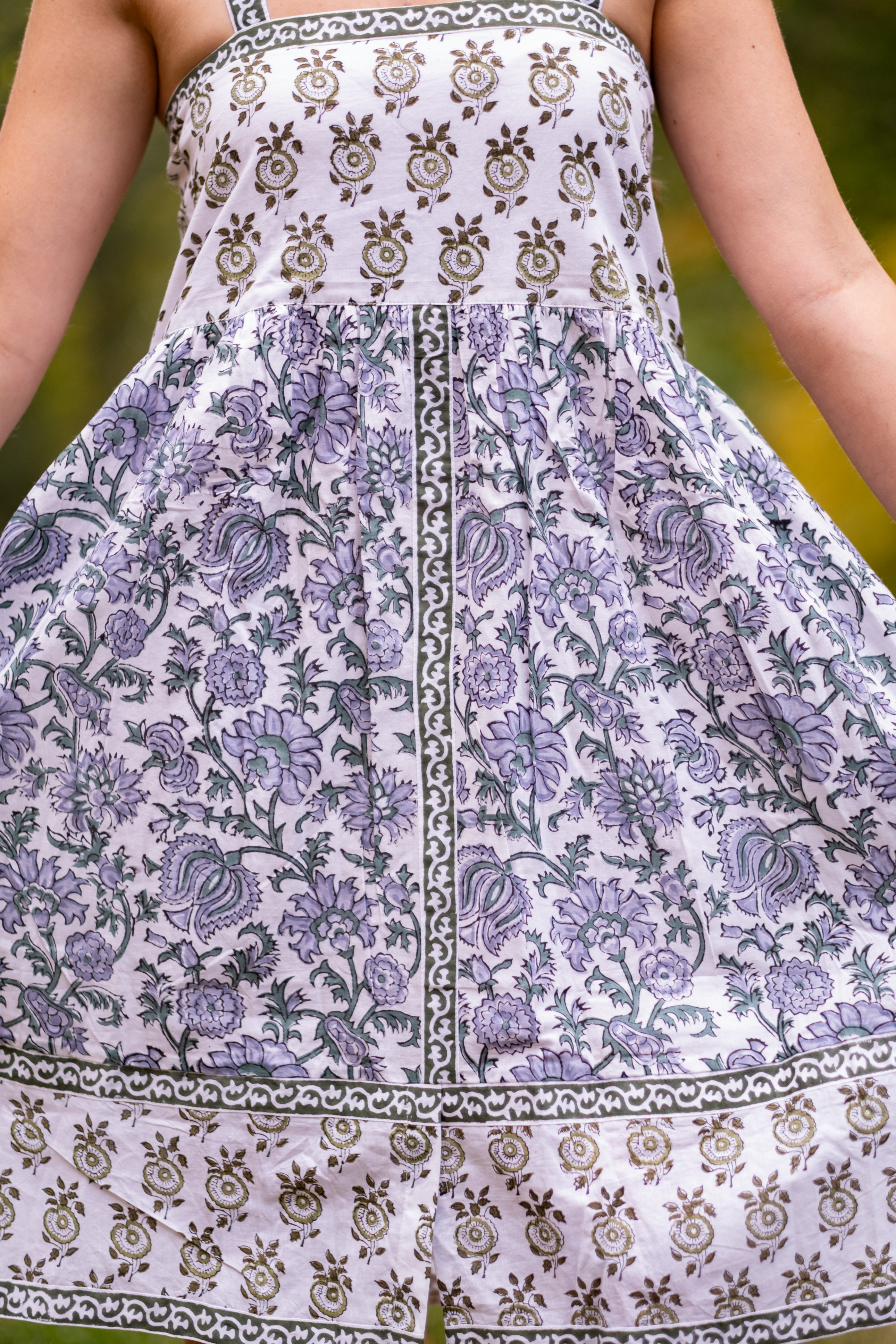 A Clarity classic in white, olive, and powder blue - Ophelia is a beautiful sundress with cool tones and beautiful florals. The green ribbon tie sleeves are hand dyed with beautiful motifs. The dress features two deep pockets, and a soft cotton voile lining for modesty and comfort. The beautiful A line dress falls at the knees, dress it up with heels or cowboy boots and sunglasses or throw on your favorite sandals.
