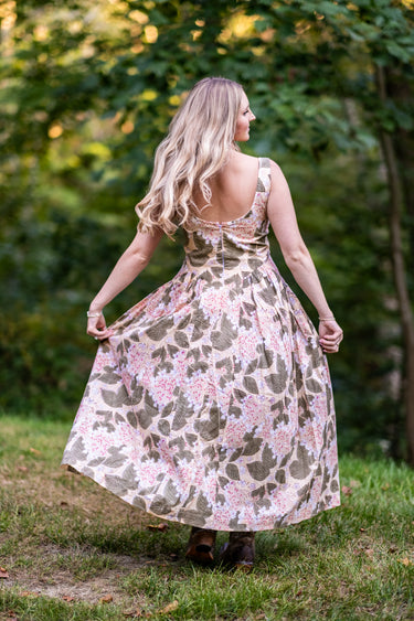 Meet Andrea. Hand-made with hand-dyed 100% organic cotton fabric, this beautiful tea length dress bears delicate floral details with small berries and leaves. The unique cut of this dress is so flattering on, and the modest scoop neckline is tapered to show off your collarbones. The bodice is lined for privacy with a zip-up back for a seamless fit. Enjoy this dress in its colors of almond, ivory, forest green, with peach colored berries.