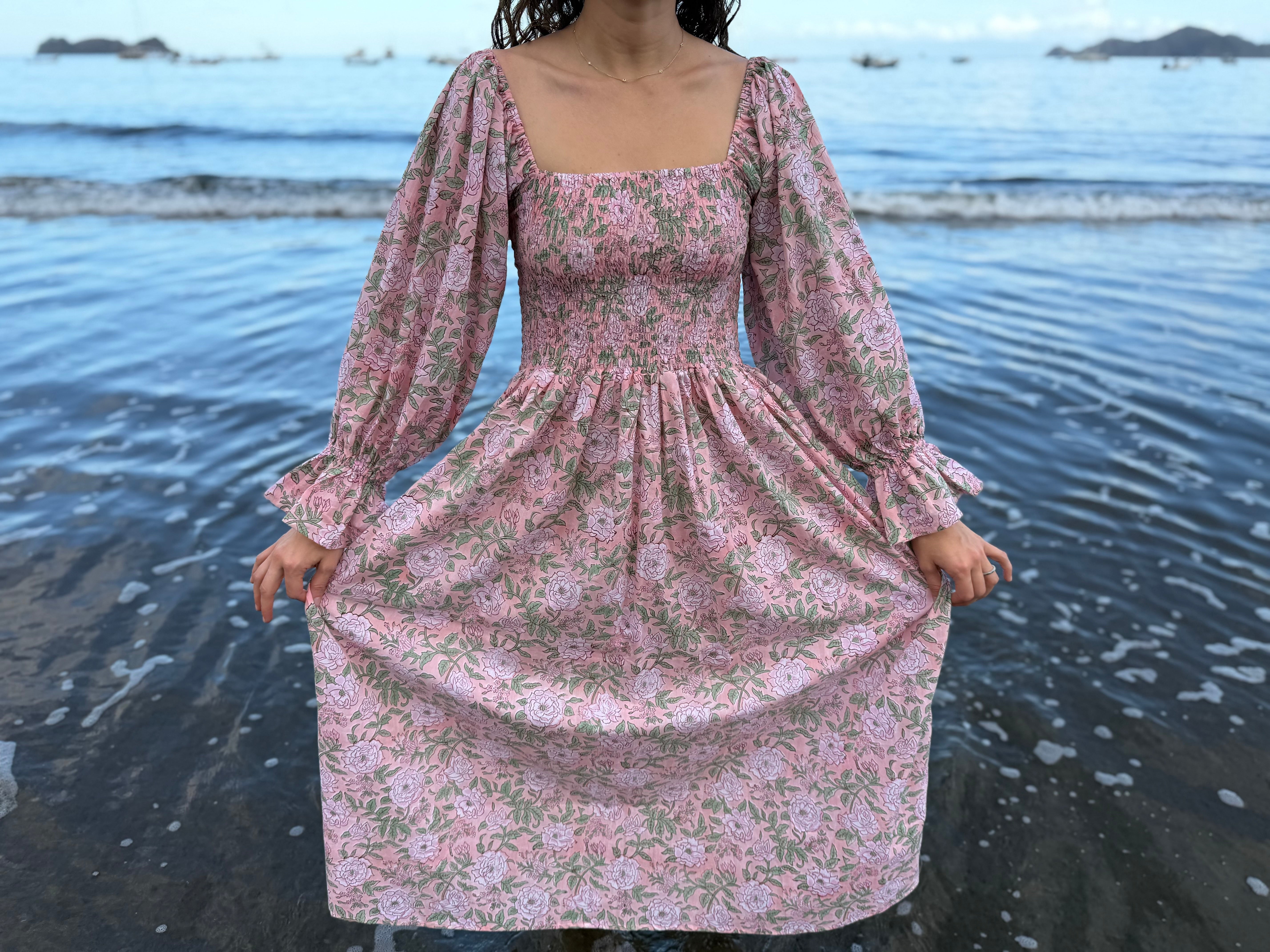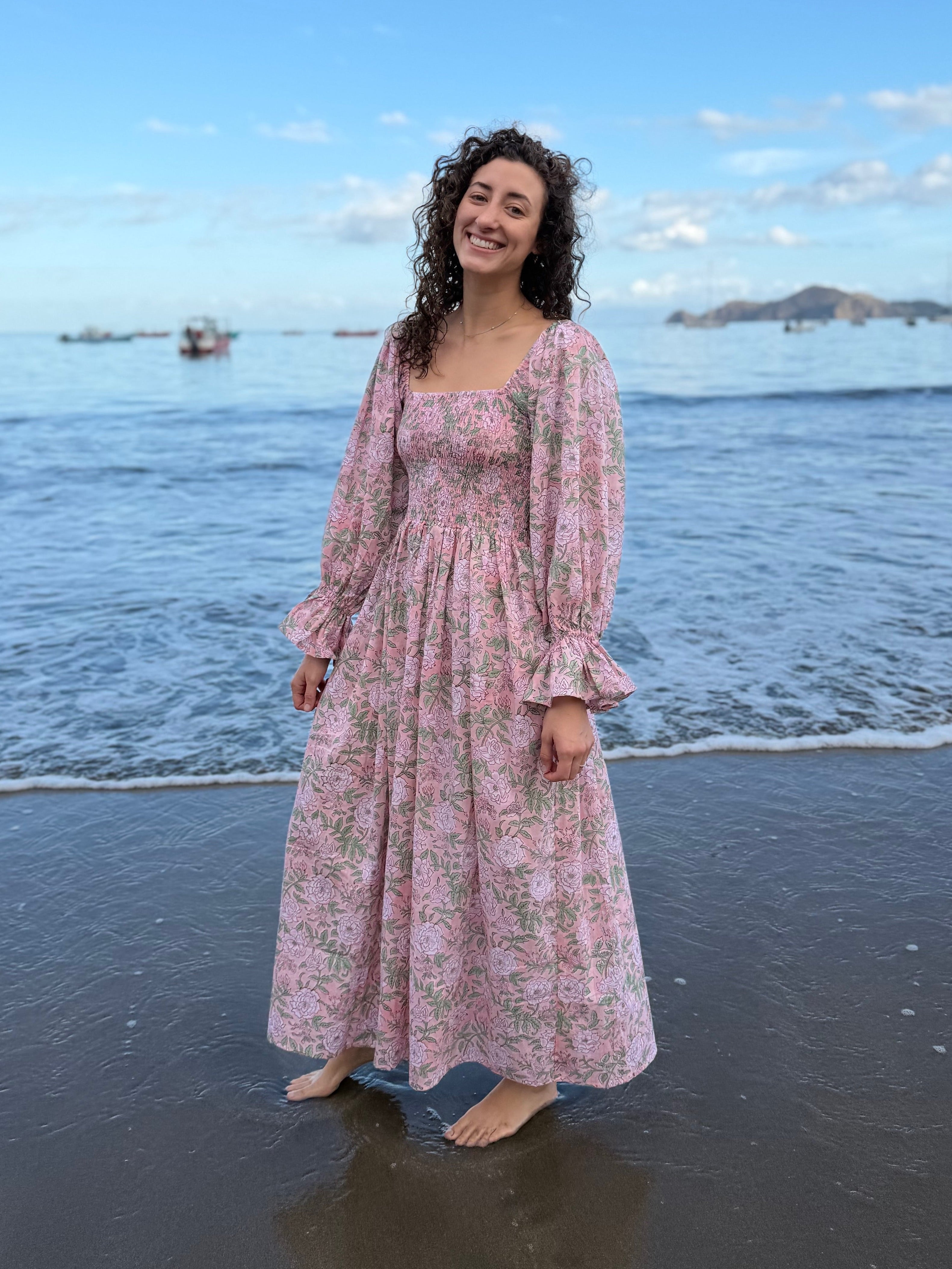 Our first Spring Debut, Anna Marie is a beautiful fresh blush color with sage embellishments. She features full length balloon sleeves with tapered flare at the end. Enjoy a stretchy, supportive bodice and the perfect long skirt. The dress features two deep pockets, and a soft cotton voile lining for modesty and comfort. The beautiful A line dress falls at the ankles, dress it up with heels or cowboy boots and sunglasses or throw on your favorite sandals.