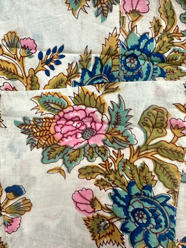 Bella is a 100% Cotton top that ties behind the neck and behind the back to ensure the perfect fit. The fabric is hand dyed with hand block printing and hand made in India. The top is beautiful in complimenting shades of gold, pink, blue, and white.