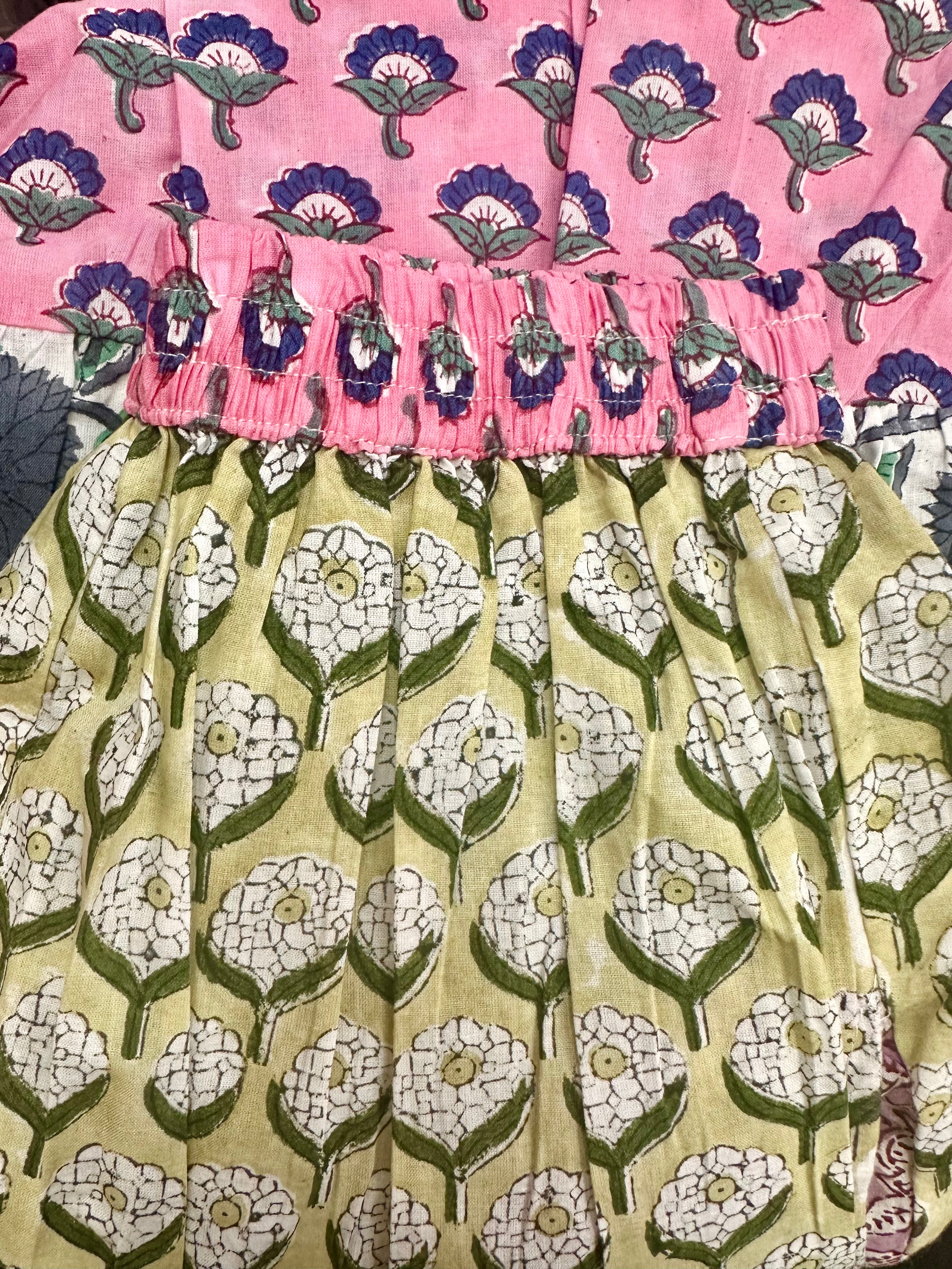 Ellie is a 100% Cotton maxi skirt that falls at ankle length, complete with pockets. The fabric is hand dyed with hand block printing and hand made in India. The top is beautiful in contrasting shades of buttercream yellow, hot pink, and navy blue.