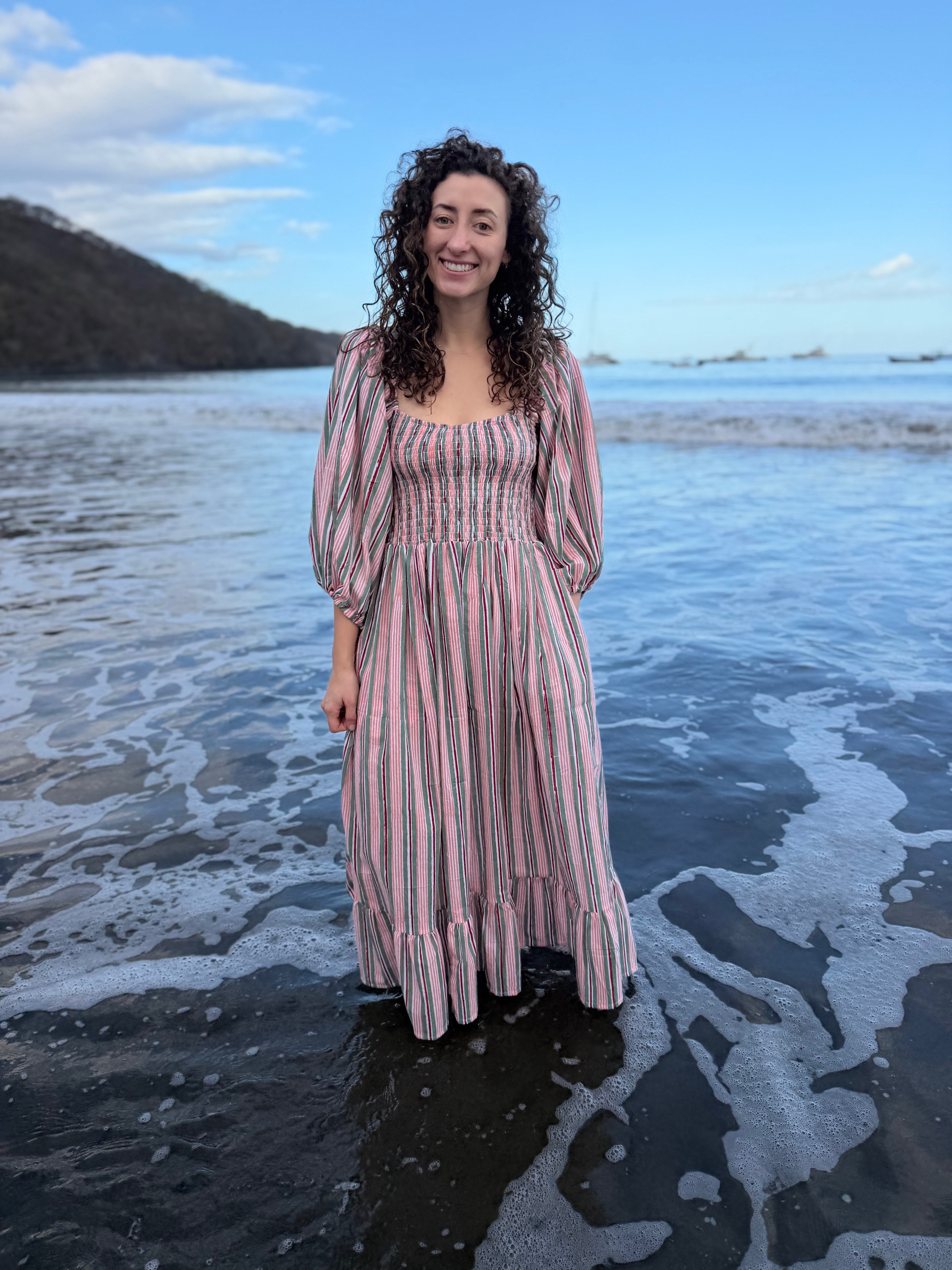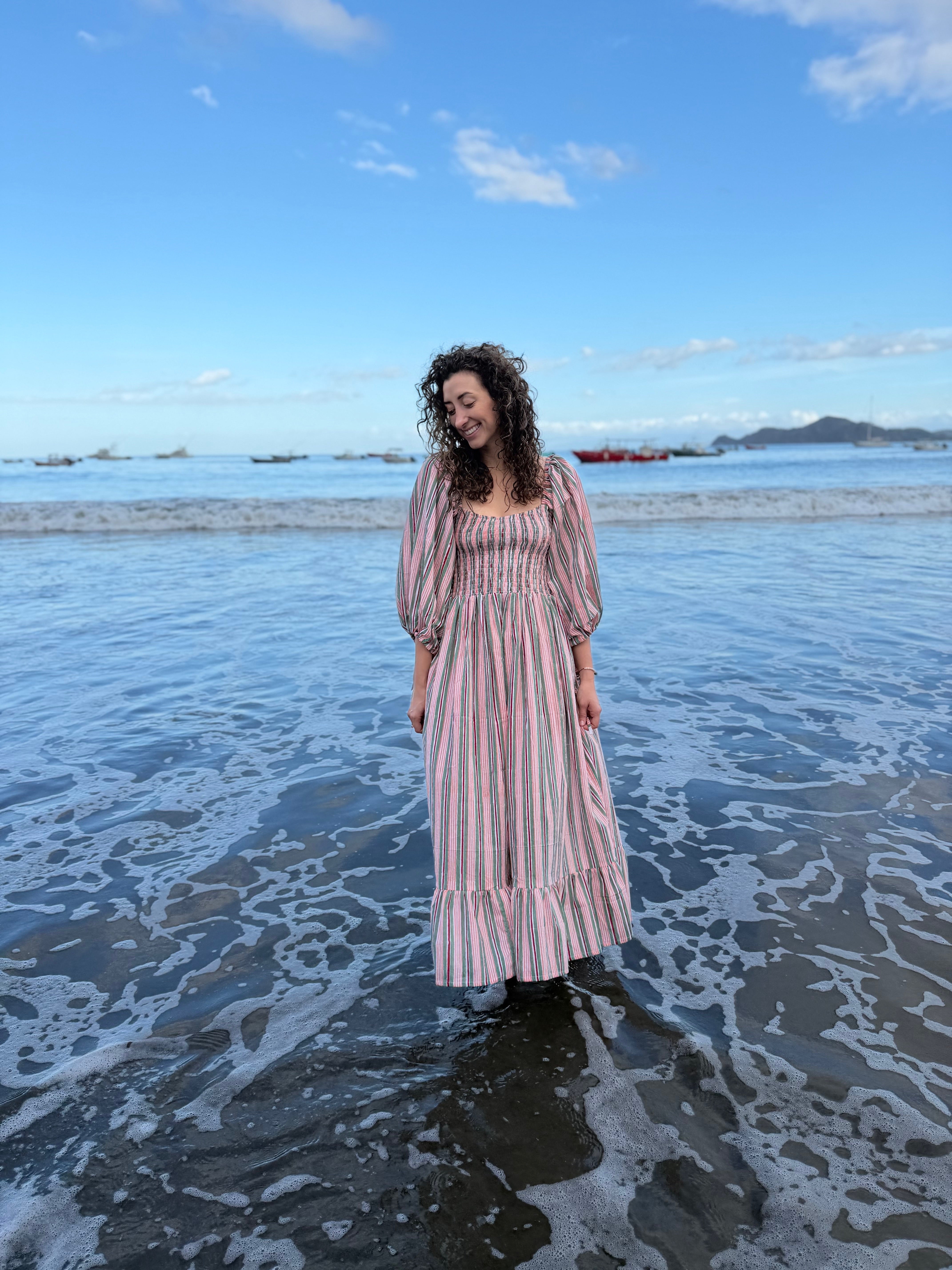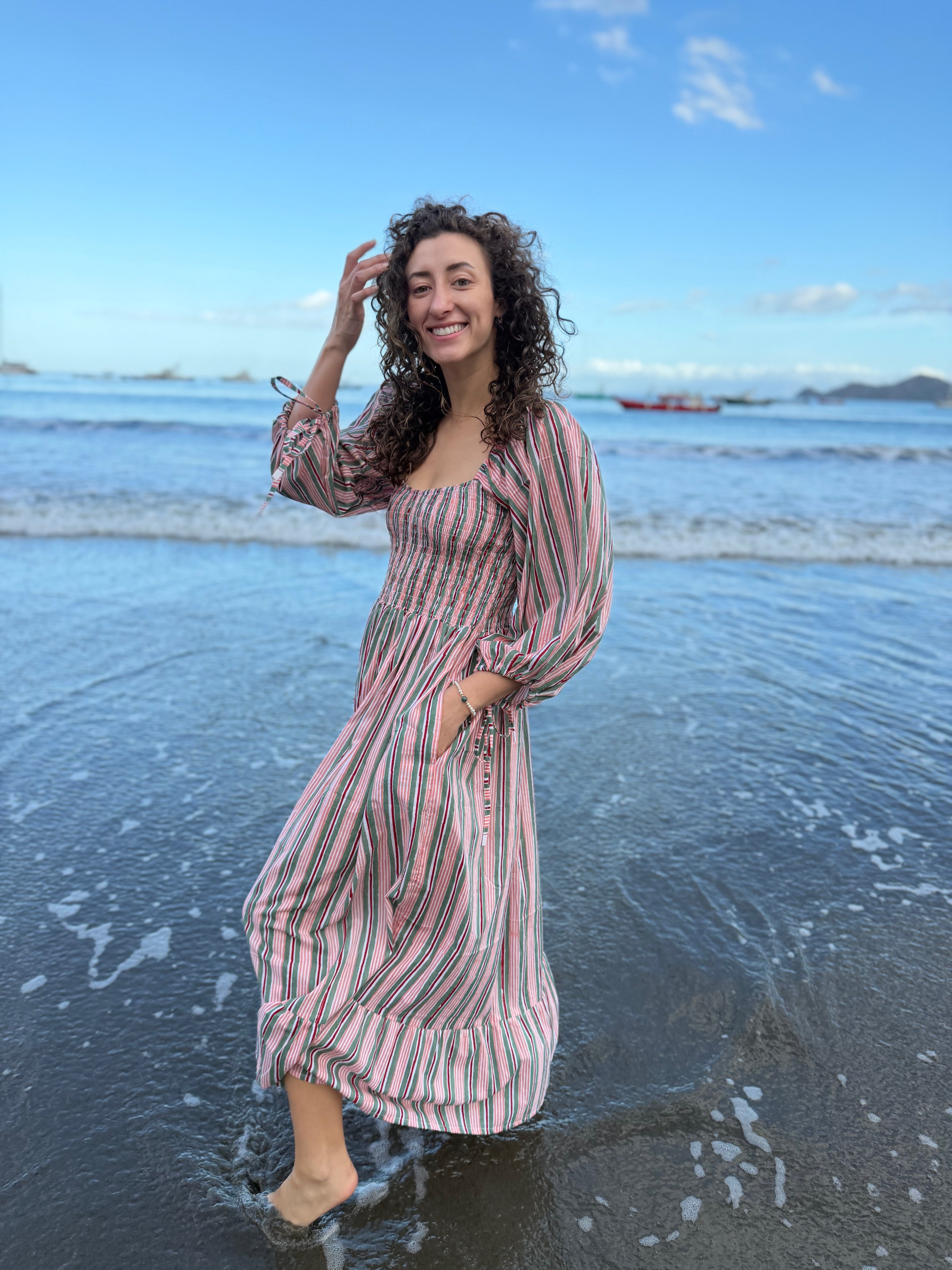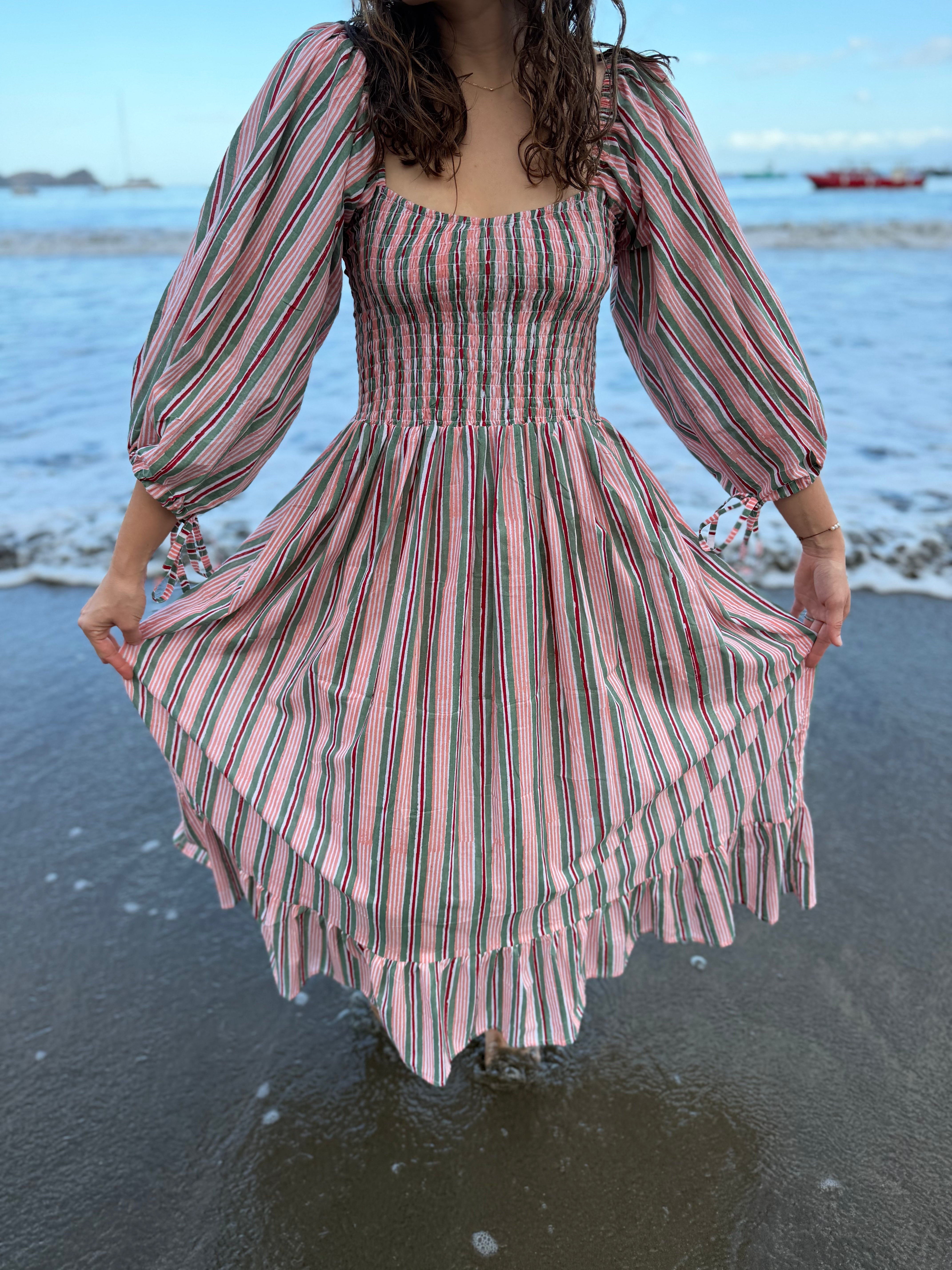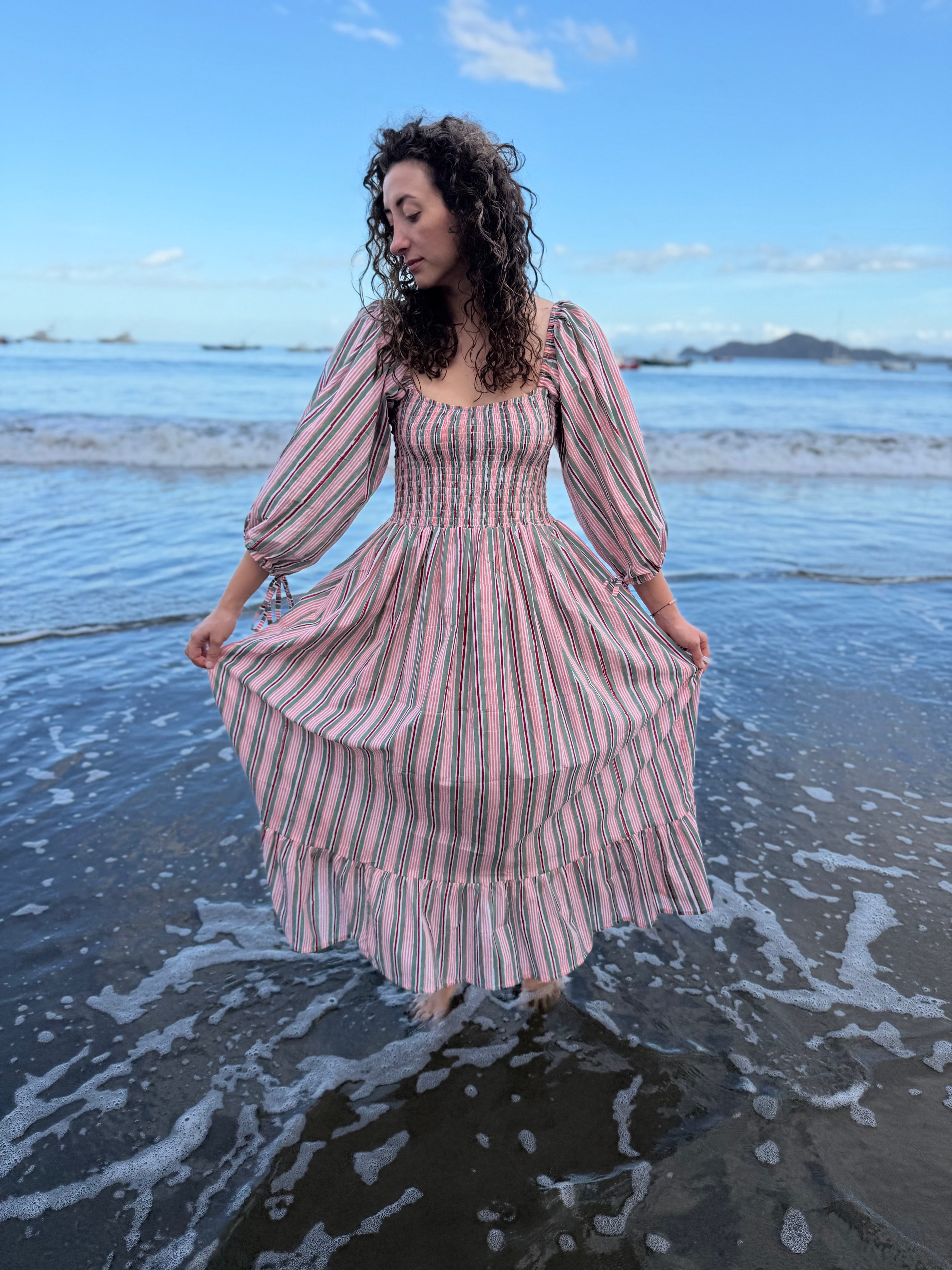 Our second Spring Debut, Seraphina is a flurry of hand dyed blush, crimson, and forest green stripes accented with white. The hand dyed nature of the fabric adds to the allure of the dress. She features 3/4 length balloon sleeves with adjustable ties for bows at the ends. Enjoy a stretchy, supportive bodice and the perfect long skirt. The dress features two deep pockets, and a soft cotton voile lining for modesty and comfort. The beautiful A line dress falls at the ankles, dress it up with heels or cowboy boots and sunglasses or throw on your favorite sandals.