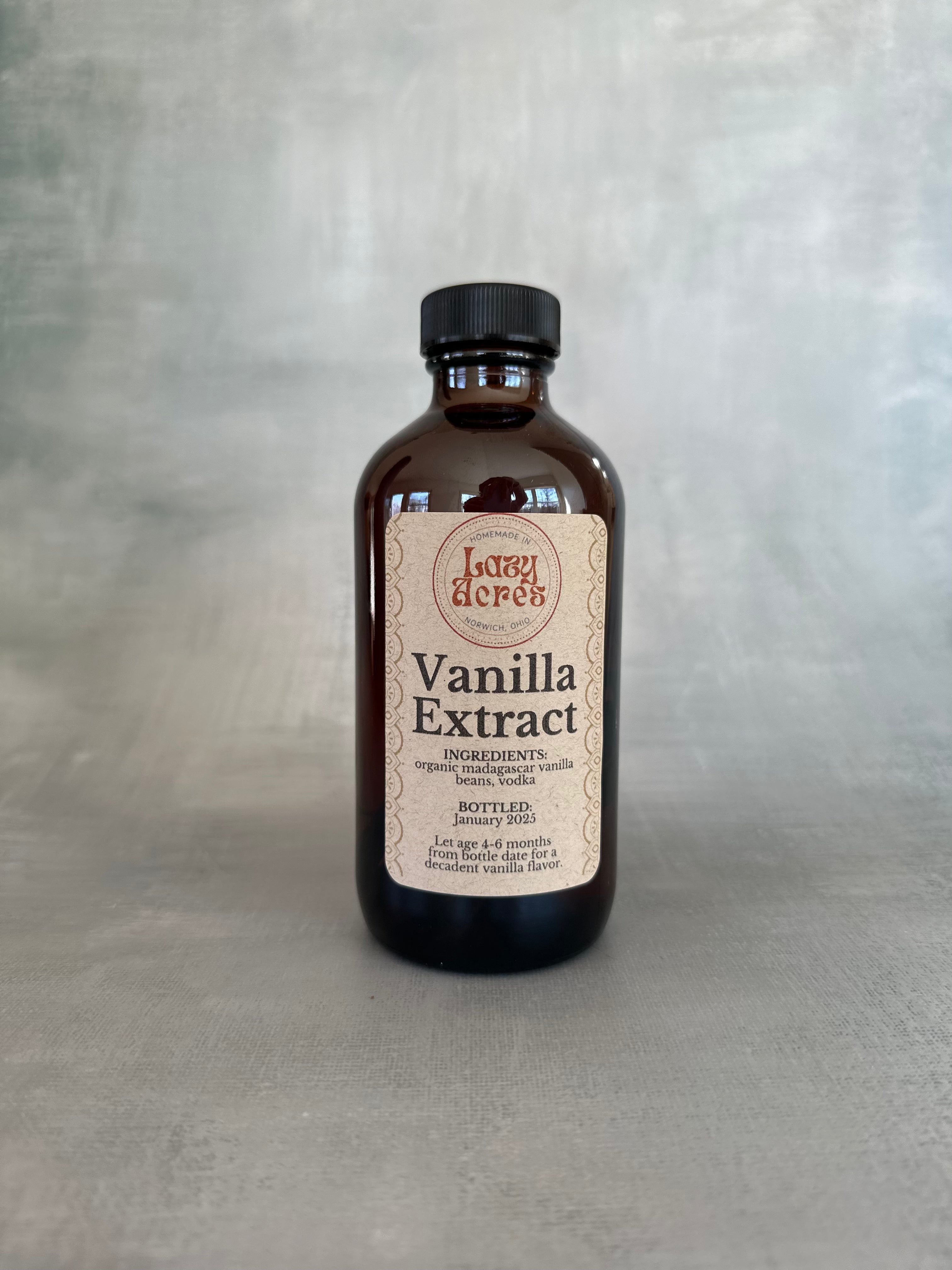 Indulge in our handmade Vanilla Extract made with organic Grade B Madagascar vanilla beans, the best kind of beans for a decadent vanilla flavor. We age the vanilla beans in Svedka vodka for 6 months. Silky yet potent, it will elevate all your baked goods.