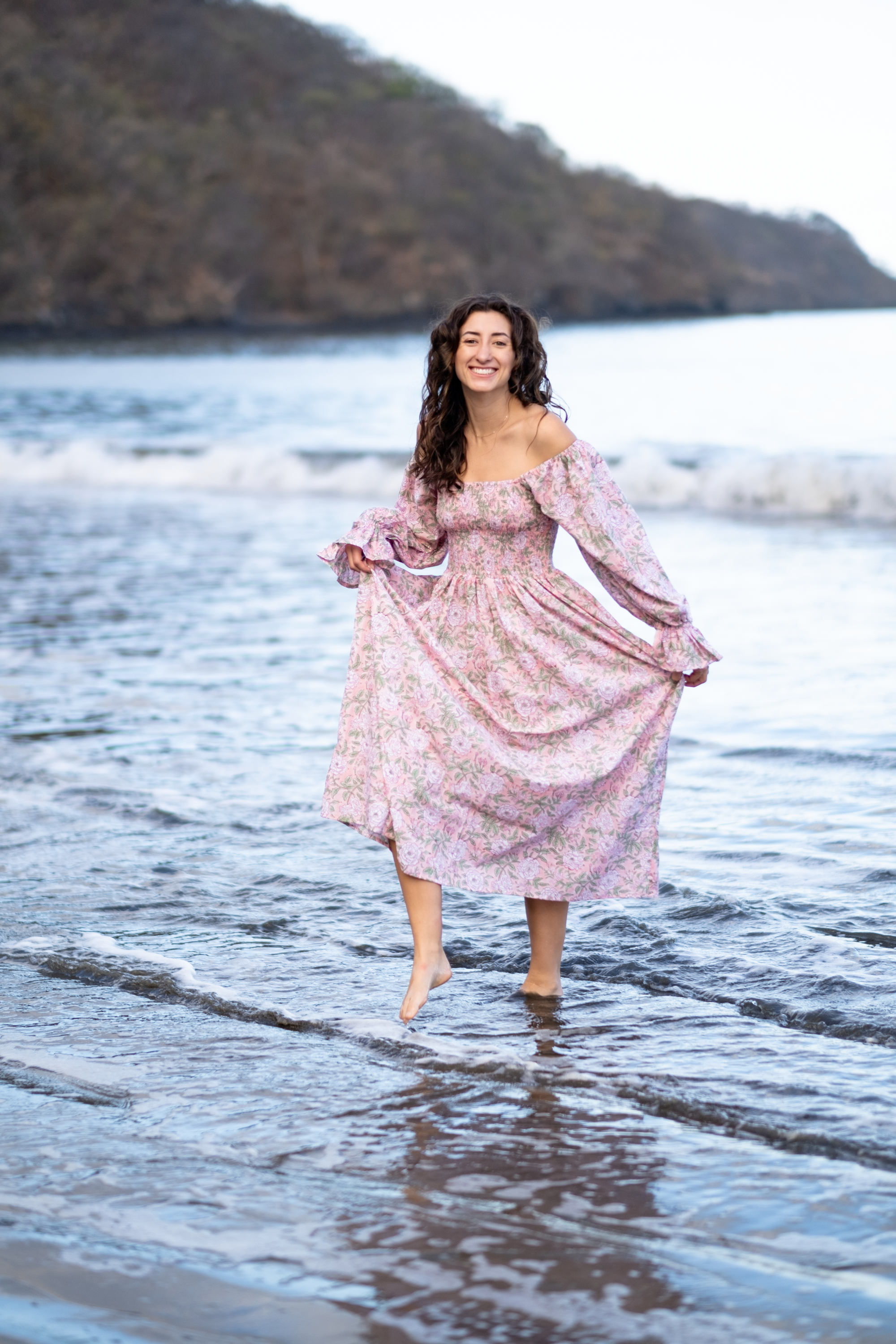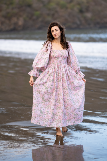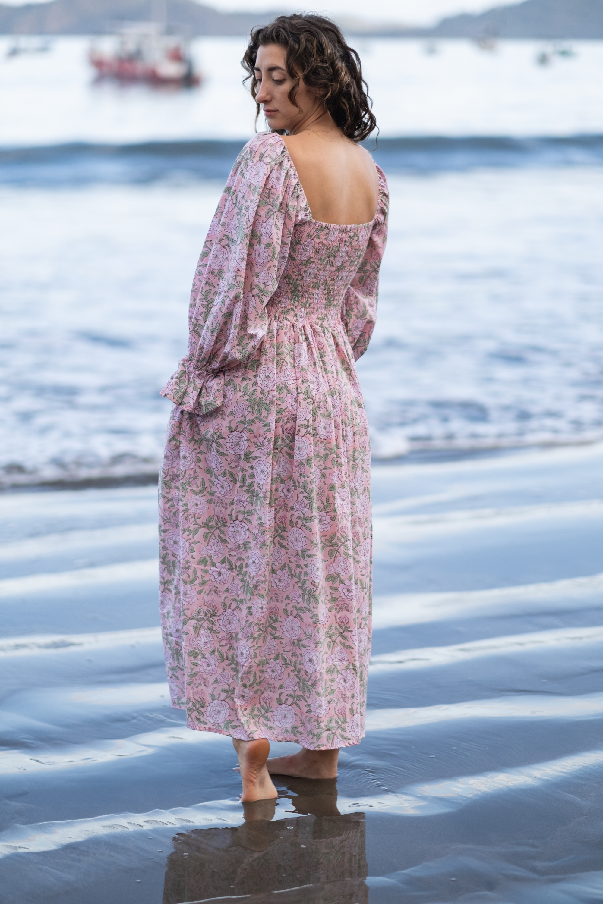 Hand-block printed in fresh blush cotton with sage embellishments, the Anna Marie is the kind of dress that feels like a deep breath. The smocked bodice stretches gently to hold you and support you through whatever the day asks, while the balloon sleeves billow and taper into a delicate flare at the wrist. Unhurried, feminine, a little romantic. The skirt falls in a clean A-line all the way to the ankle, full enough to move in, graceful enough to stand still in. Two deep pockets. A soft cotton voile lining for comfort and modesty. Everything you need, nothing you don't.