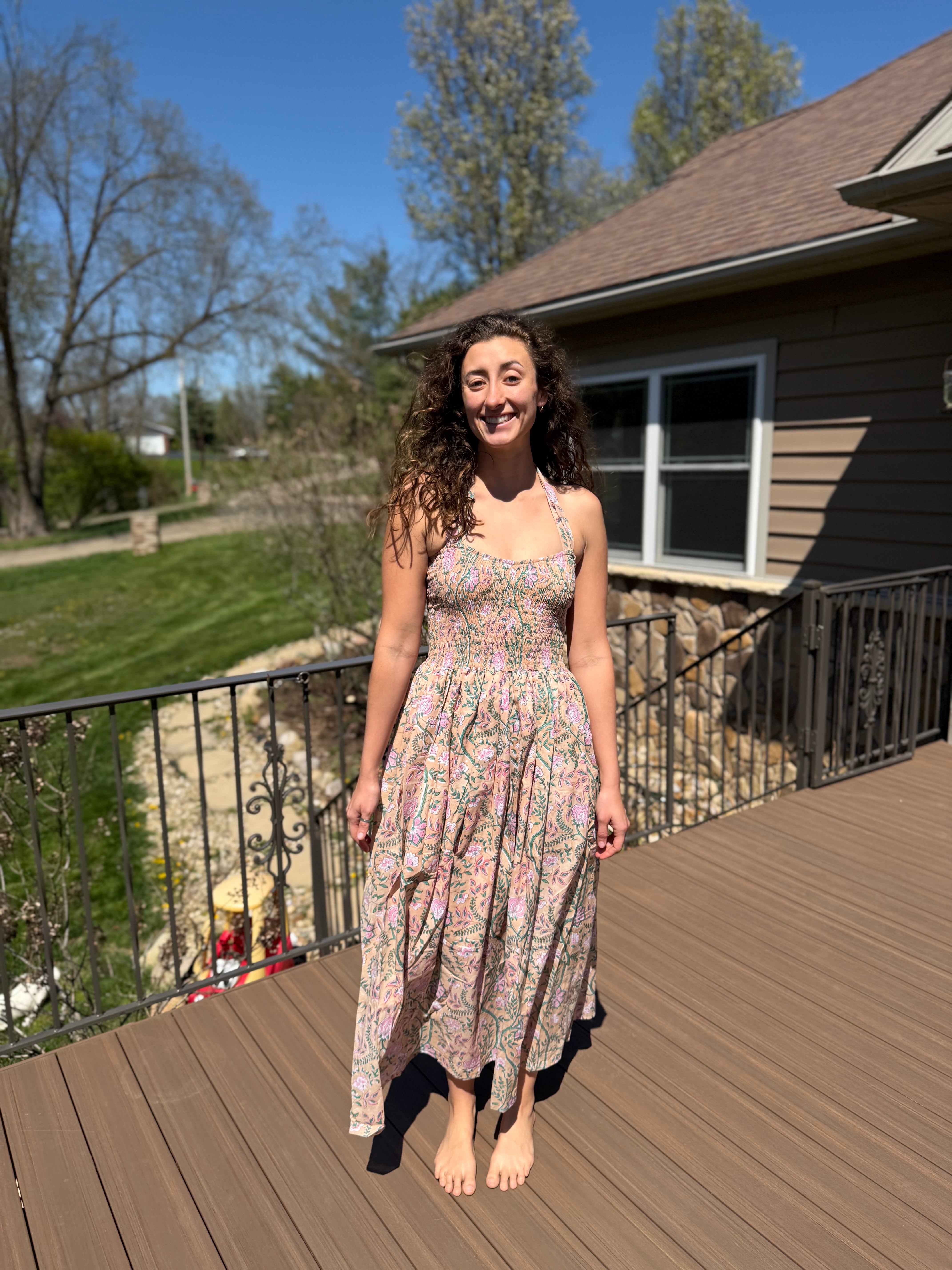 Details: Smocked V-neck bodice · Adjustable ribbon tie shoulders (over-shoulder or halter style) · Ankle length skirt · Cotton voile lined skirt · 2 deep pockets · 100% cotton · Hand-block printed
