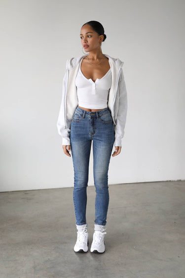 These High Rise Skinny Jeans are the perfect blend of style and comfort. With their High-rise fit and skinny leg, they offer a sleek and timeless look that won't go out of fashion. Made from premium stretch denim fabric, they'll keep their shape and keep you feeling great all day long.