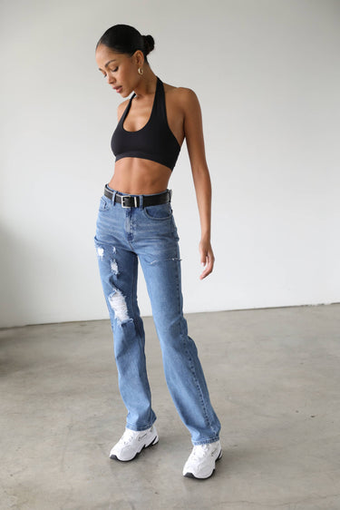 These Classic Wash High Rise Straight Leg Denim Jeans feature a one-of-a-kind side cutout, adding a touch of individuality to your style. The nostalgic blue is what you want when you think of vintage jeans. The high rise design also elongates your legs and offers added coverage. With a comfy stretch and 5 pockets, these jeans are perfect for any occasion! Button and zipper closure included.