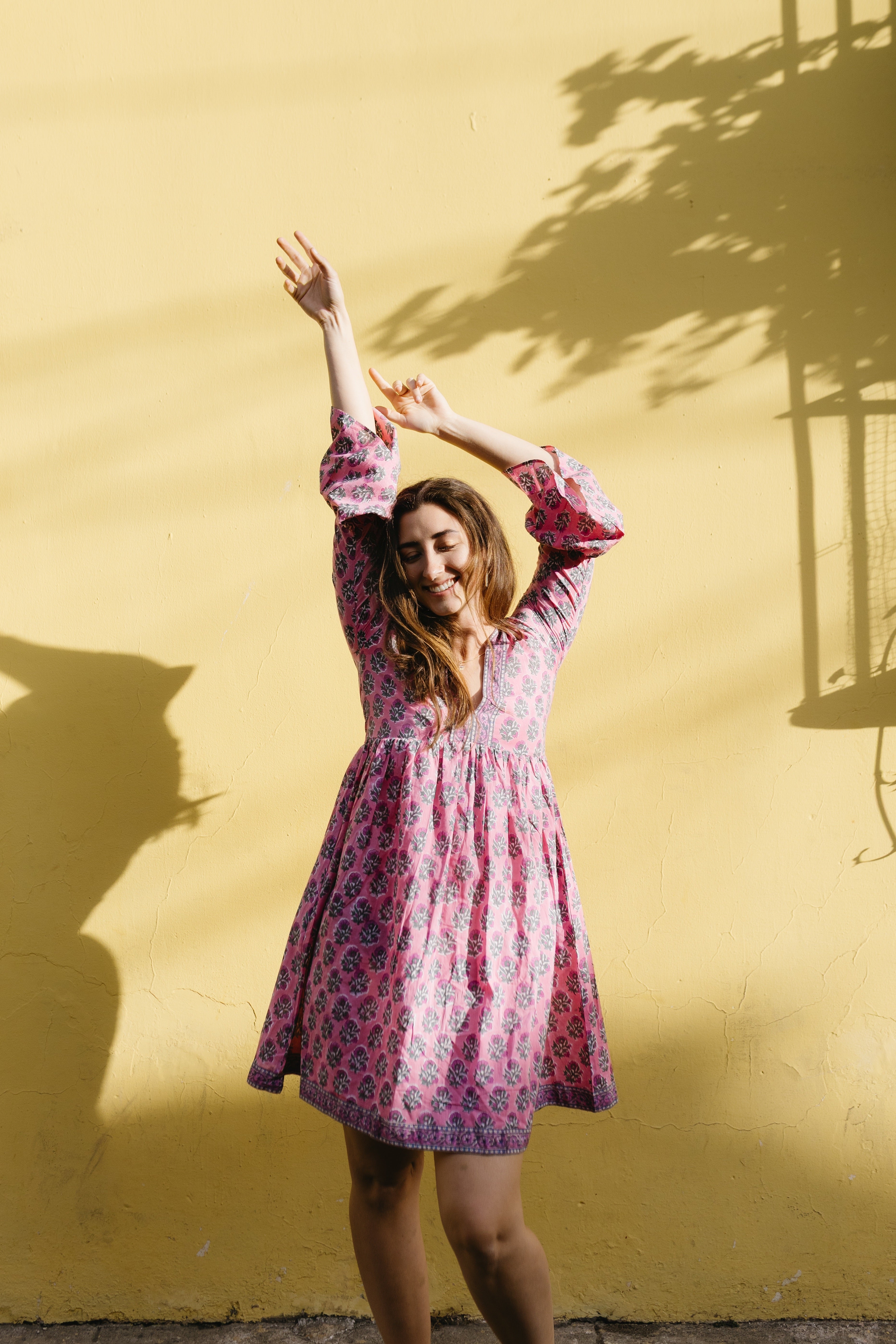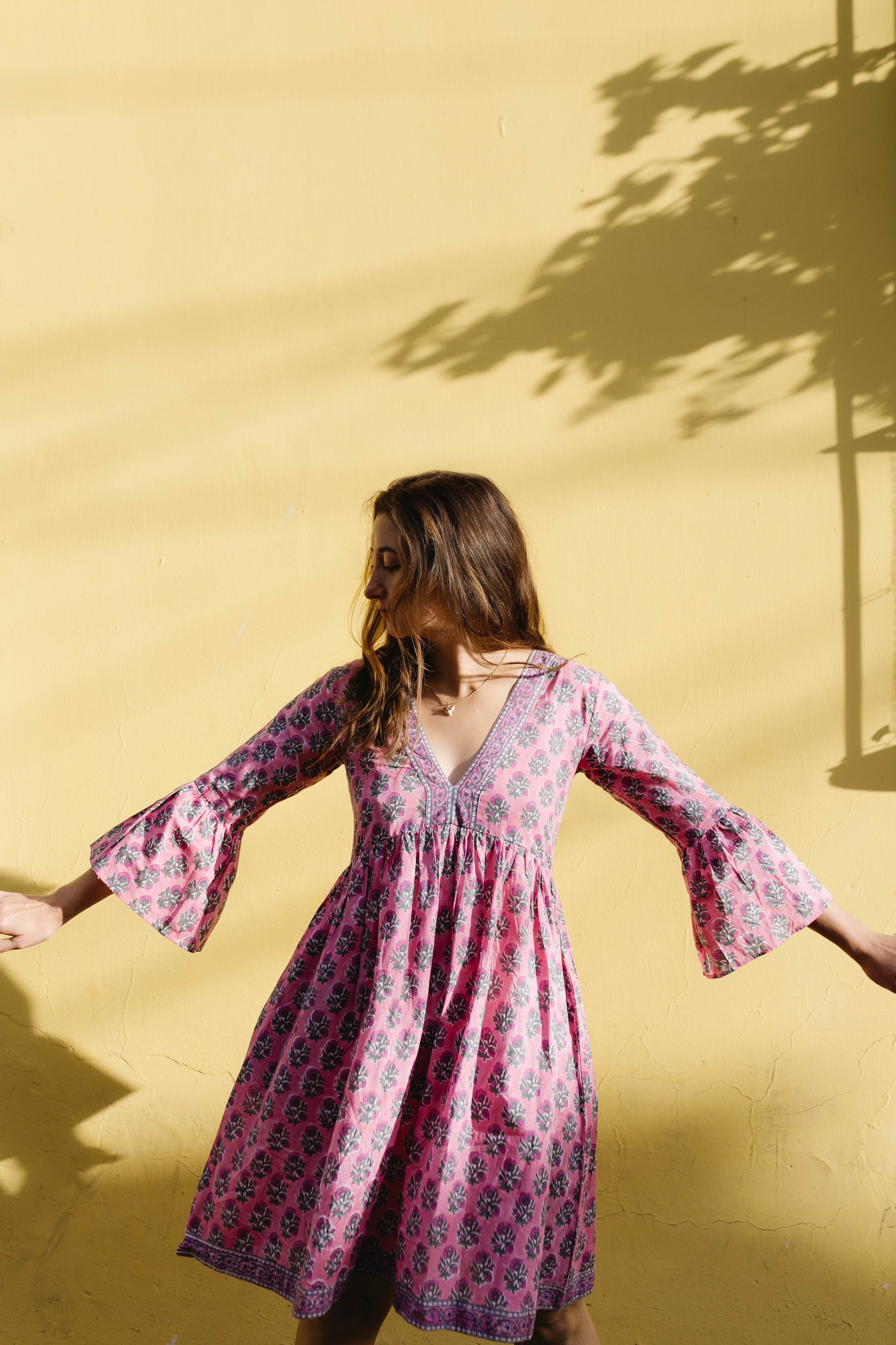Details: V-neck pleated bodice with decorative trim · Bell sleeves · Knee length skirt · 2 deep pockets · 100% organic cotton · Hand-block printed